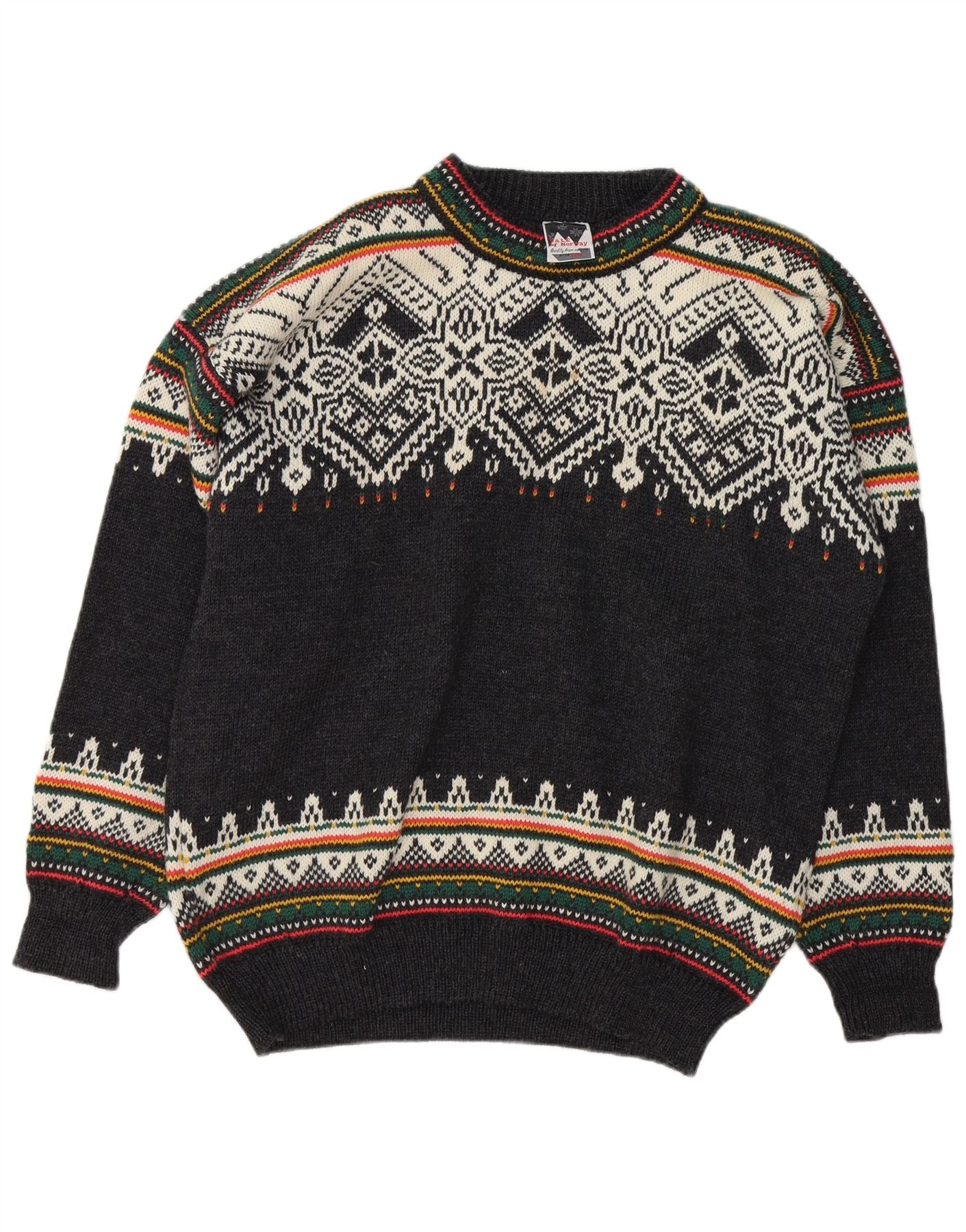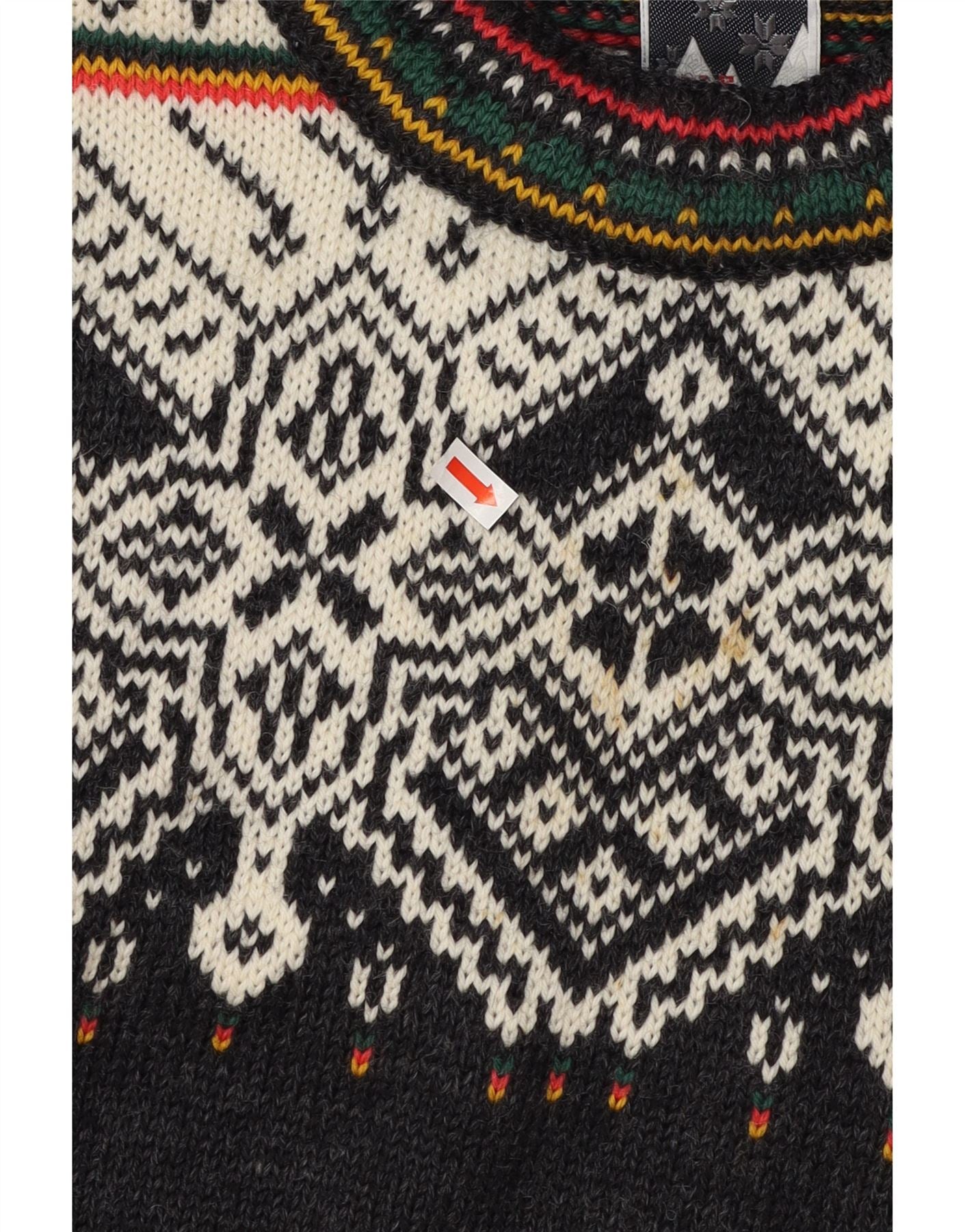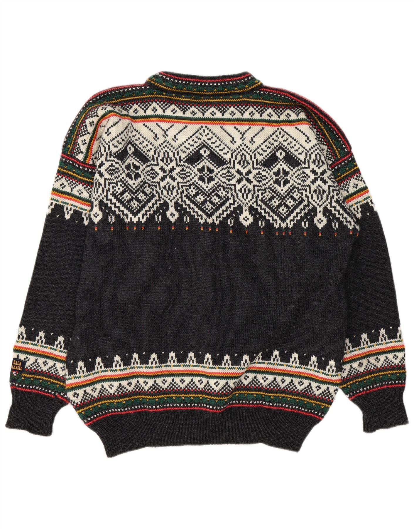 - AI Description: This Dale Of Norway mens crew neck jumper is crafted from a black knit fabric. It features a distinctive Fair Isle abstract pattern across the chest and shoulders. The classic round neck and long sleeves offer a timeless silhouette. Its pullover design ensures a regular fit for comfortable wear. This piece combines traditional craftsmanship with a refined aesthetic.
