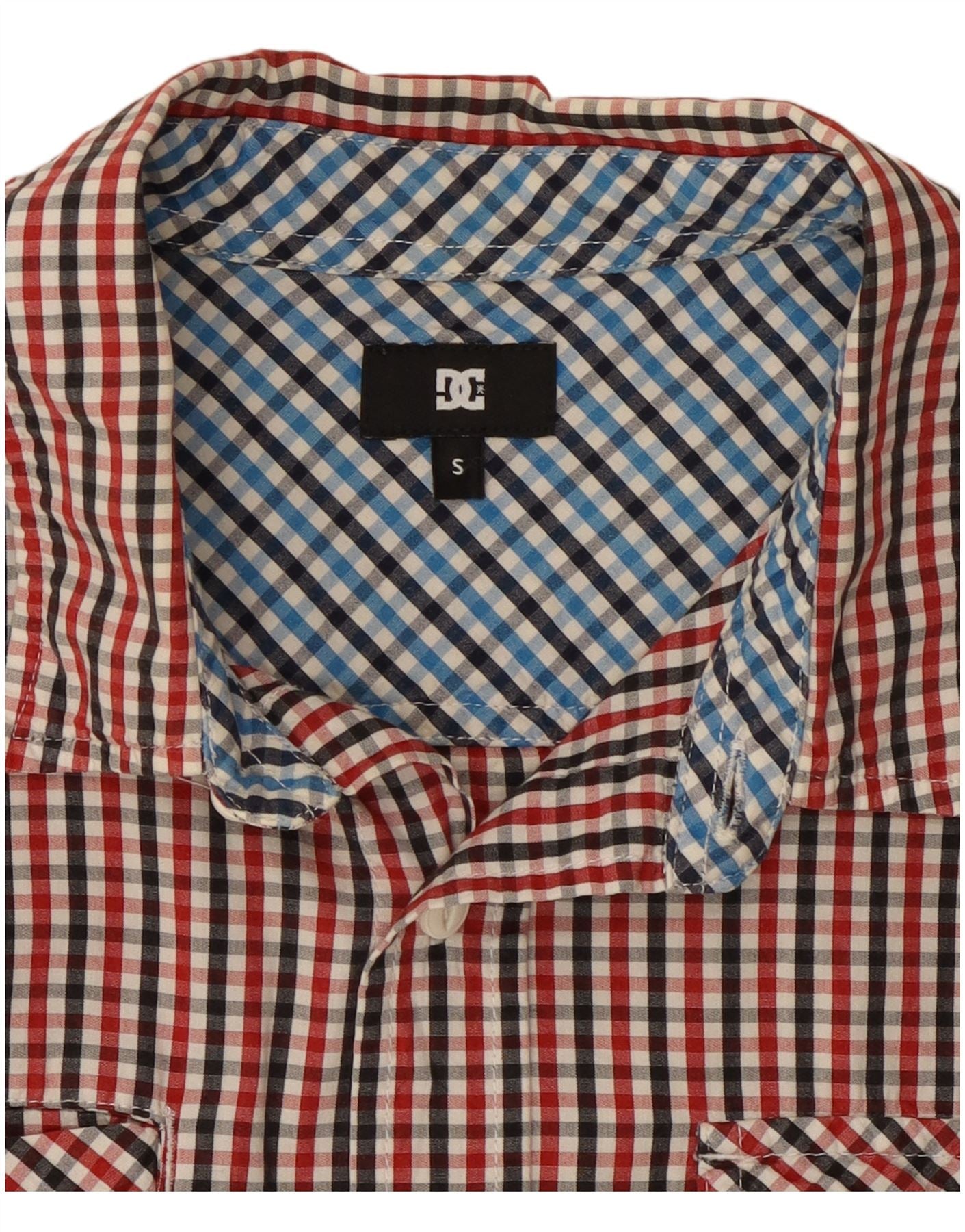 - AI Description: This DC mens shirt is crafted from a woven fabric with a crisp texture. It features a vibrant multicoloured check pattern in red, black, and white. The collared neckline and button closure offer a classic look. Short sleeves and a regular fit ensure comfortable wear. Two chest pockets add practical detail, complemented by a subtle brand logo. This shirt combines timeless style with everyday functionality.