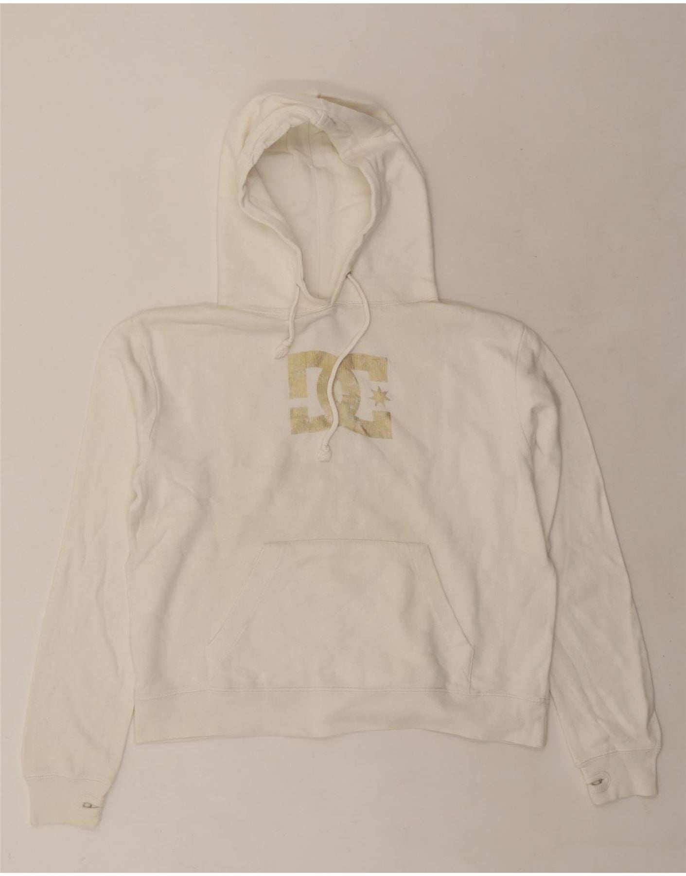 - AI Description: This DC womens hoodie jumper is crafted from soft off-white fleece knit. It features a comfortable hooded design and long sleeves. The pullover style offers a regular fit. A practical kangaroo pocket sits at the front. A prominent graphic logo adorns the chest, adding a signature brand detail. This piece combines comfort with a casual, sporty aesthetic.