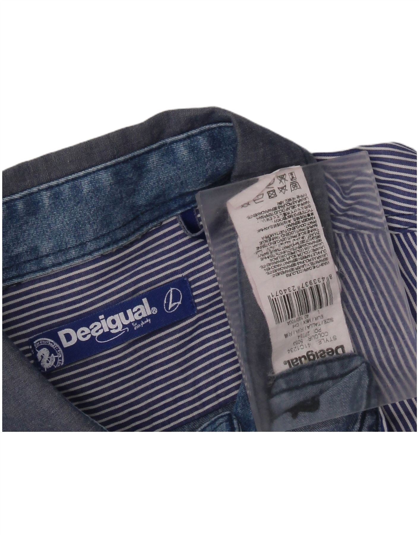 - AI Description: This Desigual mens shirt is crafted from 100 percent cotton, featuring a unique blend of denim and striped fabric. It has a collared neckline and long sleeves with buttoned cuffs. The regular fit ensures comfortable wear. The design showcases a striking striped pattern on one side, contrasting with plain blue denim on the other. Tonal buttons secure the front closure. A subtle logo detail adds brand recognition.
