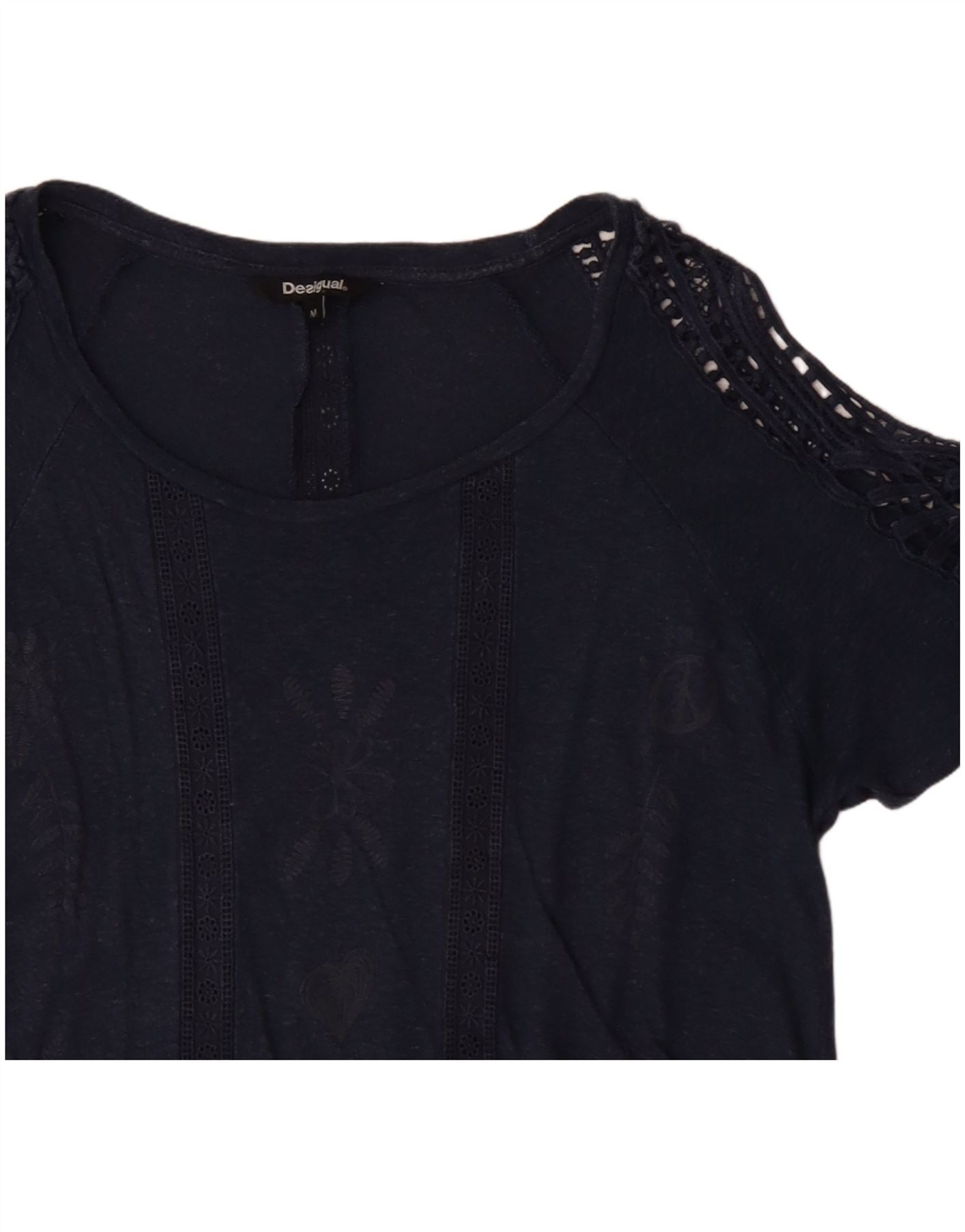 - AI Description: This Desigual womens T-Shirt Top is crafted from a soft blue knit fabric. It features a classic round neckline and short sleeves. Intricate floral graphics adorn the front, adding visual interest. Delicate crochet detailing enhances the shoulders and sleeves. The regular fit offers comfortable wear. This pullover style embodies a bohemian aesthetic, perfect for a relaxed yet stylish look.