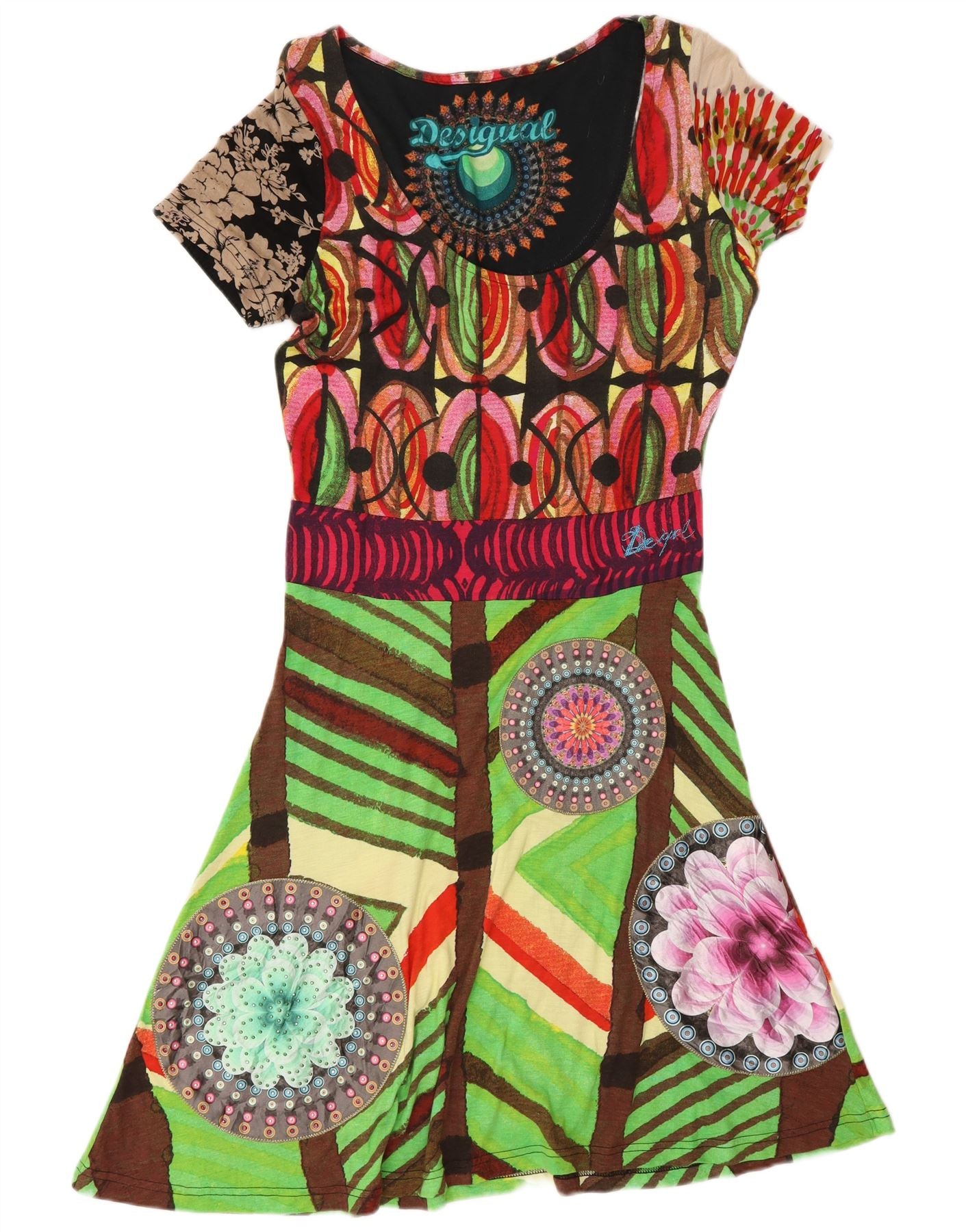 - AI Description: This Desigual womens T-shirt dress is crafted from a soft viscose and cotton blend fabric. It features a vibrant multicoloured geometric pattern throughout, showcasing a crazy, artistic flair. The dress has a classic round neckline and short sleeves. Its regular fit offers comfortable wear, with a simple pullover style. A distinctive logo detail subtly accents the design. This colourful piece combines comfort with bold, unique style.