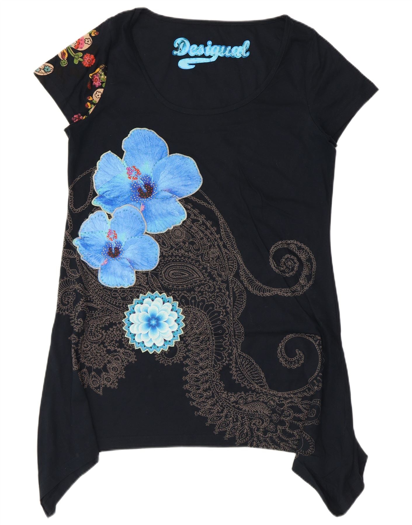 - AI Description: This Desigual womens Graphic T-Shirt Top is crafted from soft black jersey fabric. It features a classic round neck and short sleeves. The regular fit offers comfortable wear. A vibrant floral and abstract pattern adorns the front, enhanced with sequin accents. One shoulder also displays a colourful floral print. The design embodies a distinctive bohemian style, perfect for a unique casual look.
