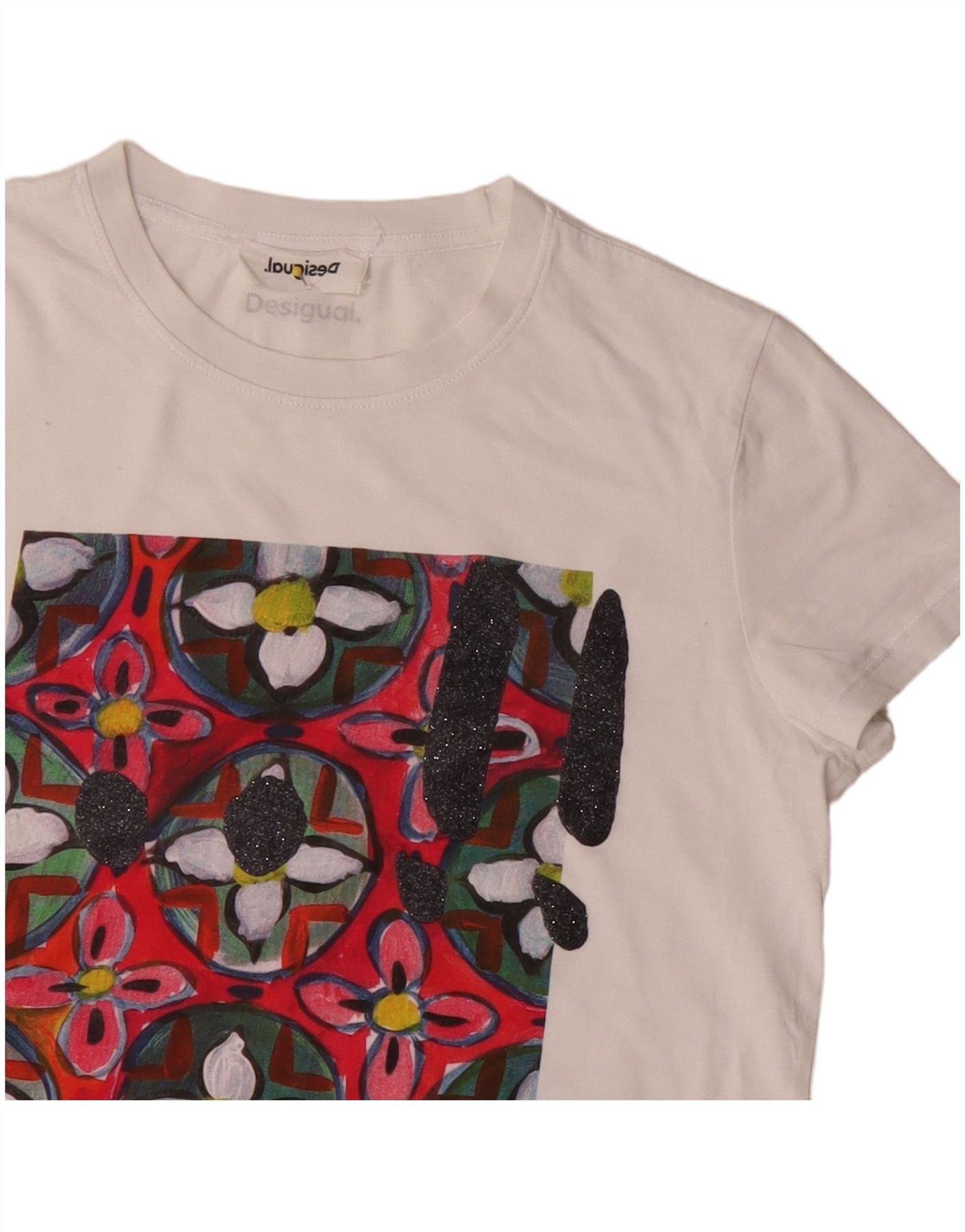 - AI Description: This Desigual womens Graphic T-Shirt Top is crafted from soft white jersey fabric. It features a classic round neck and short sleeves. The front showcases a vibrant floral pattern with glitter accents. Its regular fit offers comfortable wear, making it a colourful and stylish addition to any casual wardrobe.