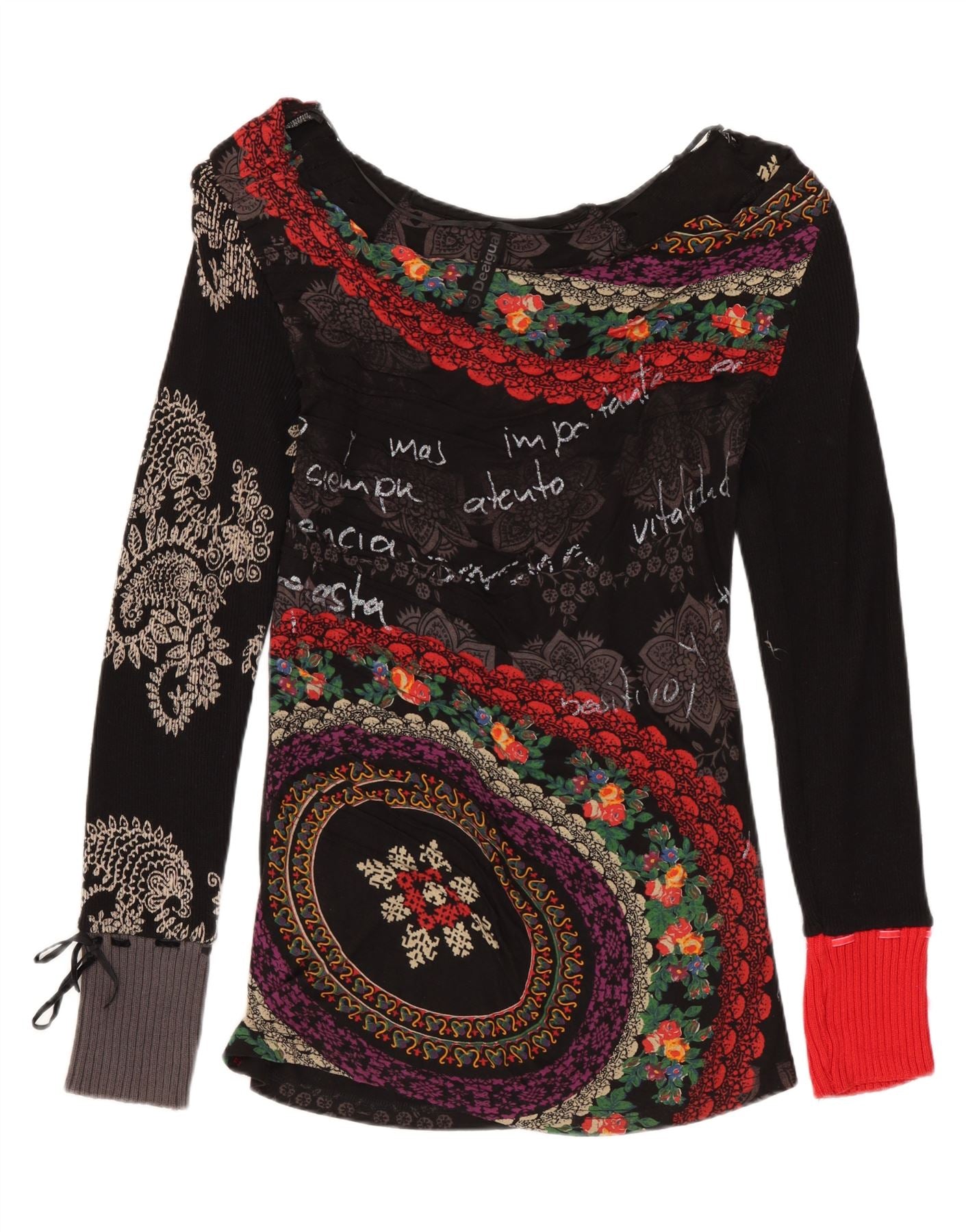 DESIGUAL Womens Graphic Top Long Sleeve UK 12 Medium Black Floral Cotton