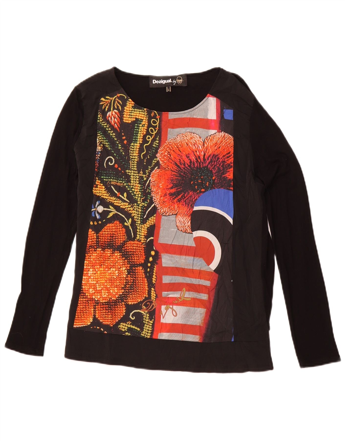 DESIGUAL Womens Graphic Top Long Sleeve UK 14 Large Black Floral Viscose