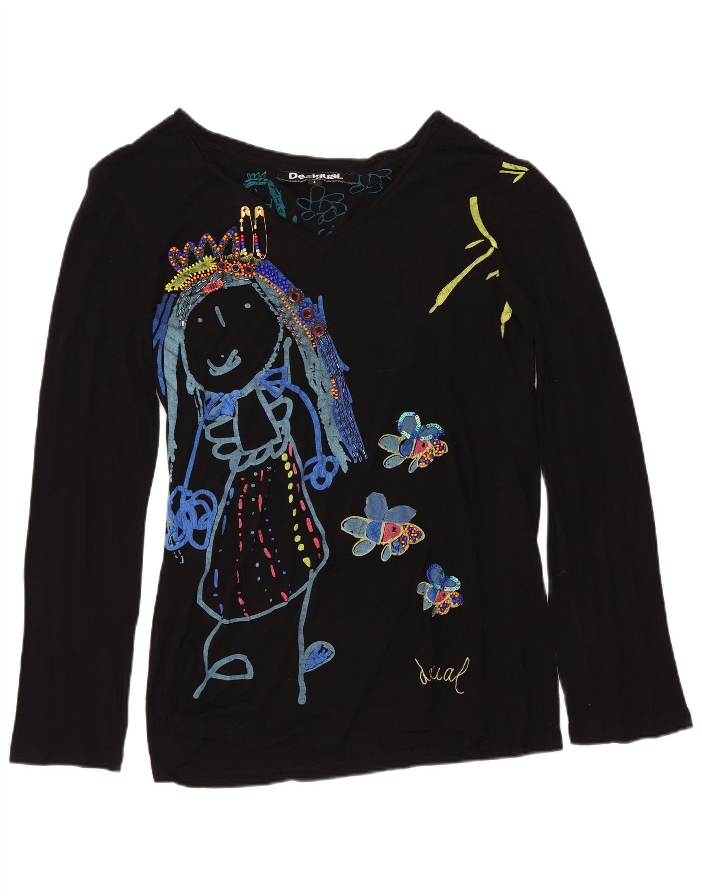 - AI Description: This Desigual womens Graphic T-Shirt Top is crafted from soft black jersey fabric. It features a V-neckline and long sleeves. The regular fit offers comfortable wear. A vibrant cartoon graphic adorns the front. This design includes colourful embroidered accents and beaded details, adding a playful touch. The pullover style ensures easy dressing.