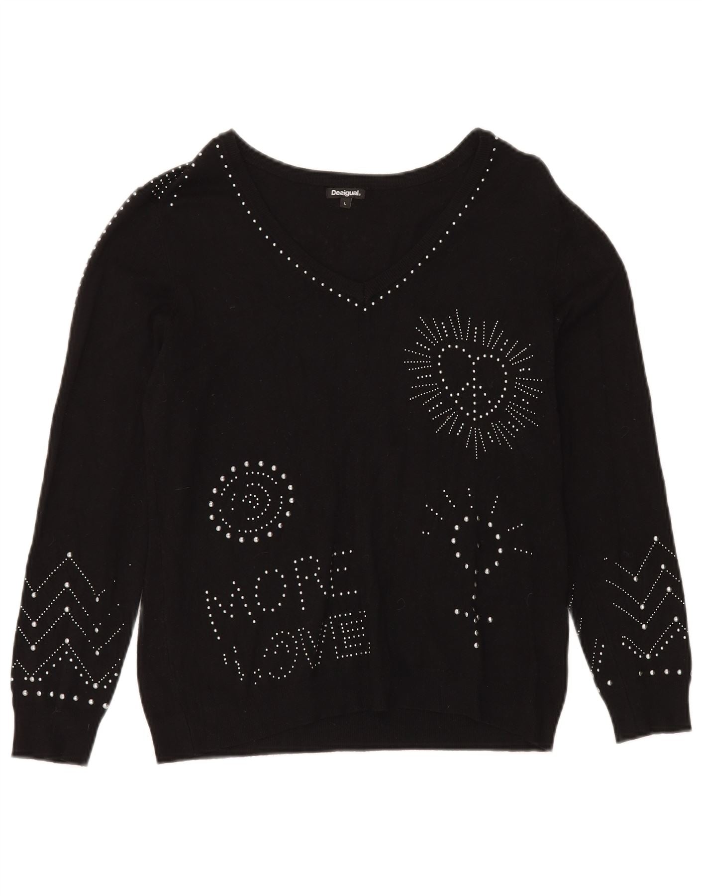 DESIGUAL Womens Graphic V-Neck Jumper Sweater UK 16 Large Black Synthetic