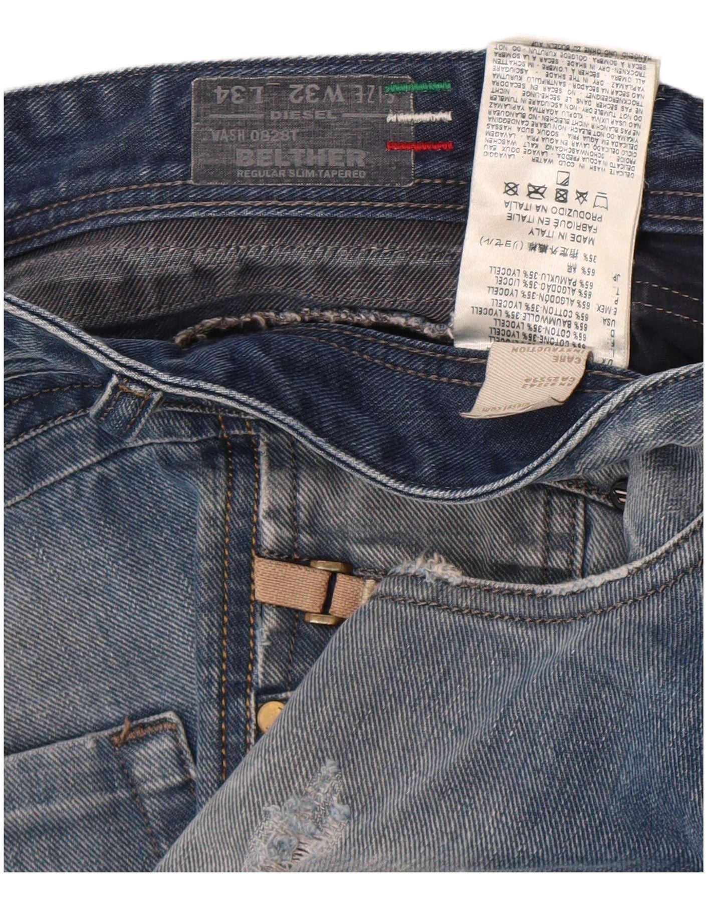 - AI Description: These Diesel men's tapered jeans are crafted from a blue cotton-lyocell blend denim. The fabric has a soft yet durable feel. They feature a slim fit with tapered legs. A button closure secures the front. Distressed detailing adds a rugged, worn-in aesthetic. Classic five-pocket styling provides practicality. A subtle brand logo accents the design.