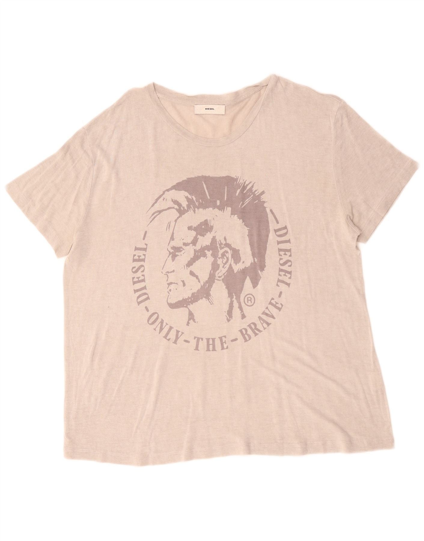 - AI Description: This Diesel womens Graphic T-Shirt Top is crafted from soft beige jersey fabric. It features a classic round neck and short sleeves. The regular fit offers comfortable wear. A prominent Diesel Only The Brave graphic logo adorns the front. This pullover style provides effortless casual appeal, perfect for everyday styling.
