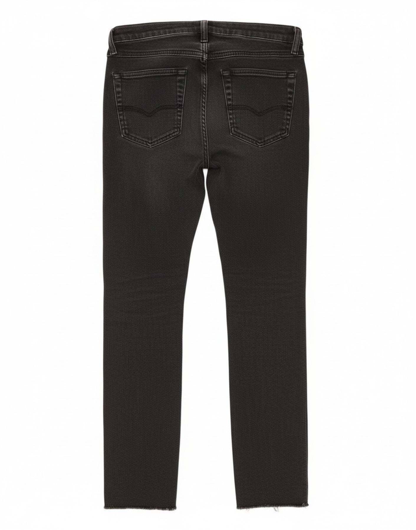 - AI Description: This Diesel womens skinny jeans are crafted from black denim with a distressed finish. They feature a mid rise waist and a button closure. The slim fit design tapers to a cropped length. The hems are raw and frayed. Classic pockets are included. A subtle brand logo adds a signature touch.