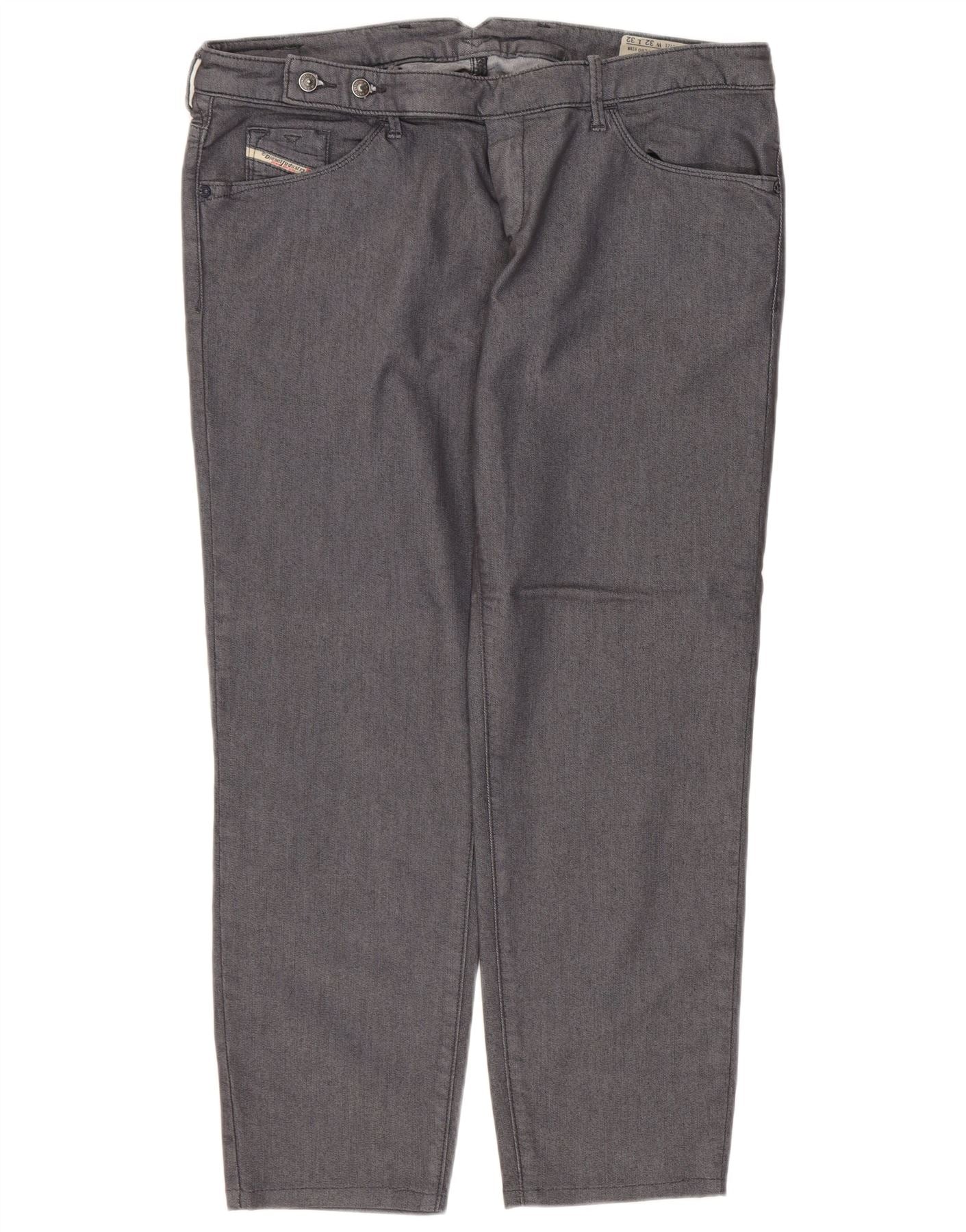 - AI Description: These Diesel women's cropped jeans are crafted from a grey cotton blend denim. They feature a mid-rise waist and a button closure for a secure fit. The regular fit offers comfortable wear. Practical pockets are included. A subtle brand logo accent adds a signature touch. The modern style makes them versatile.