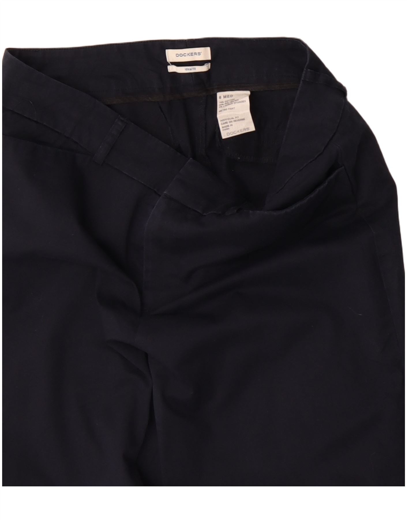 - AI Description: This Dockers womens chino trousers are crafted from a comfortable navy blue cotton blend. The woven fabric offers a smooth texture with a hint of stretch. They feature a classic mid-rise waist and a secure button closure. The straight leg cut provides a regular fit for timeless style. Practical pockets complete this versatile design.