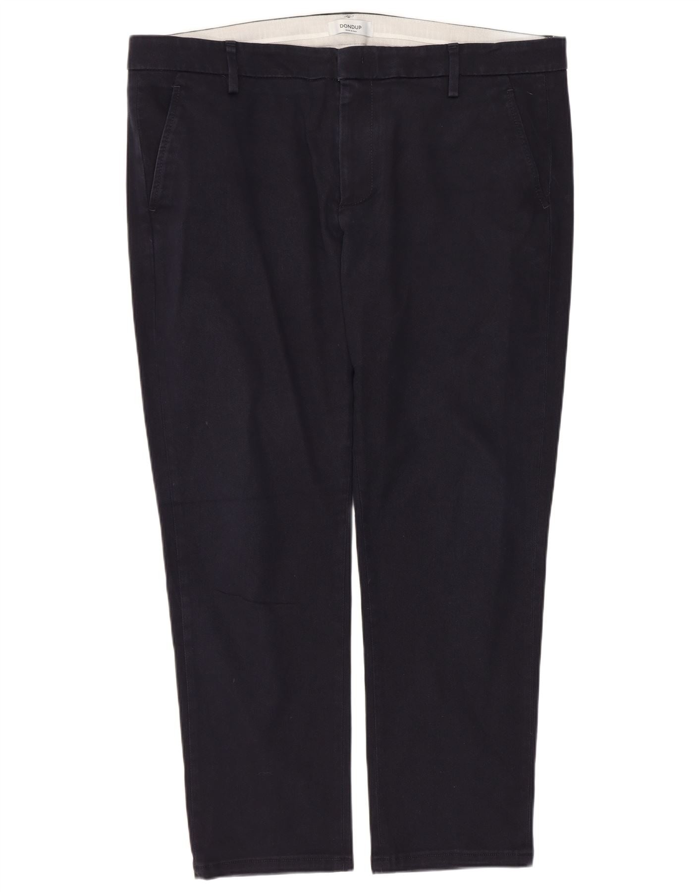 - AI Description: This Dondup mens chino trousers are crafted from a navy blue blended fabric, offering a smooth, refined texture. They feature a regular fit with straight legs for a classic silhouette. The zip closure ensures a neat front. Practical pockets are integrated seamlessly into the design. The overall style is modern and versatile.