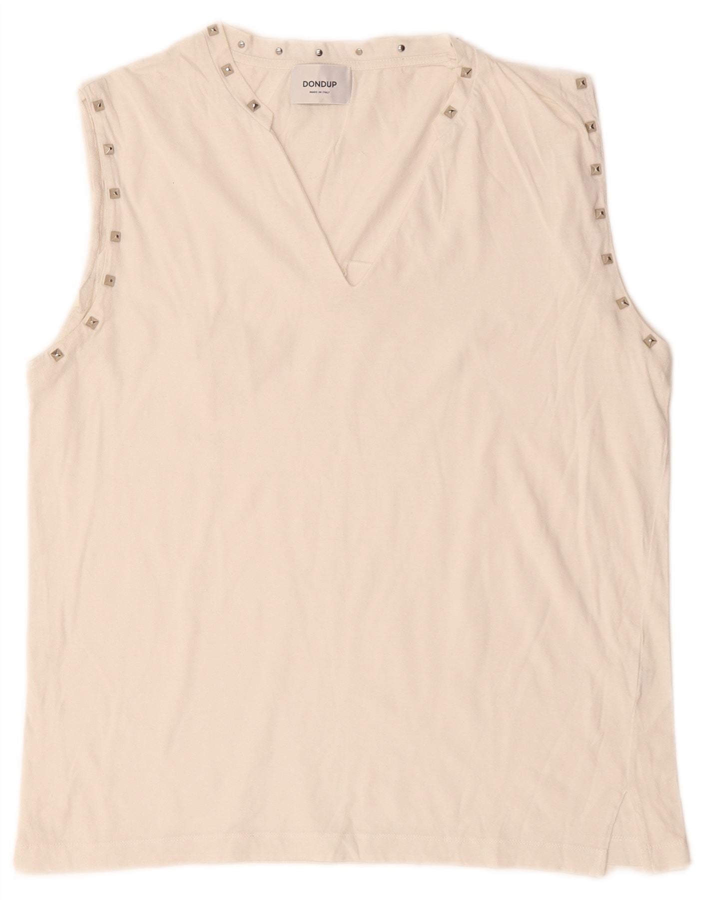 - AI Description: This Dondup womens sleeveless T-shirt top is crafted from soft off-white jersey fabric. It features a modern V-neckline and a regular fit. The shoulders and neckline are accented with stylish studs, adding a contemporary edge. This pullover design offers a sleek, comfortable silhouette for a modern look.