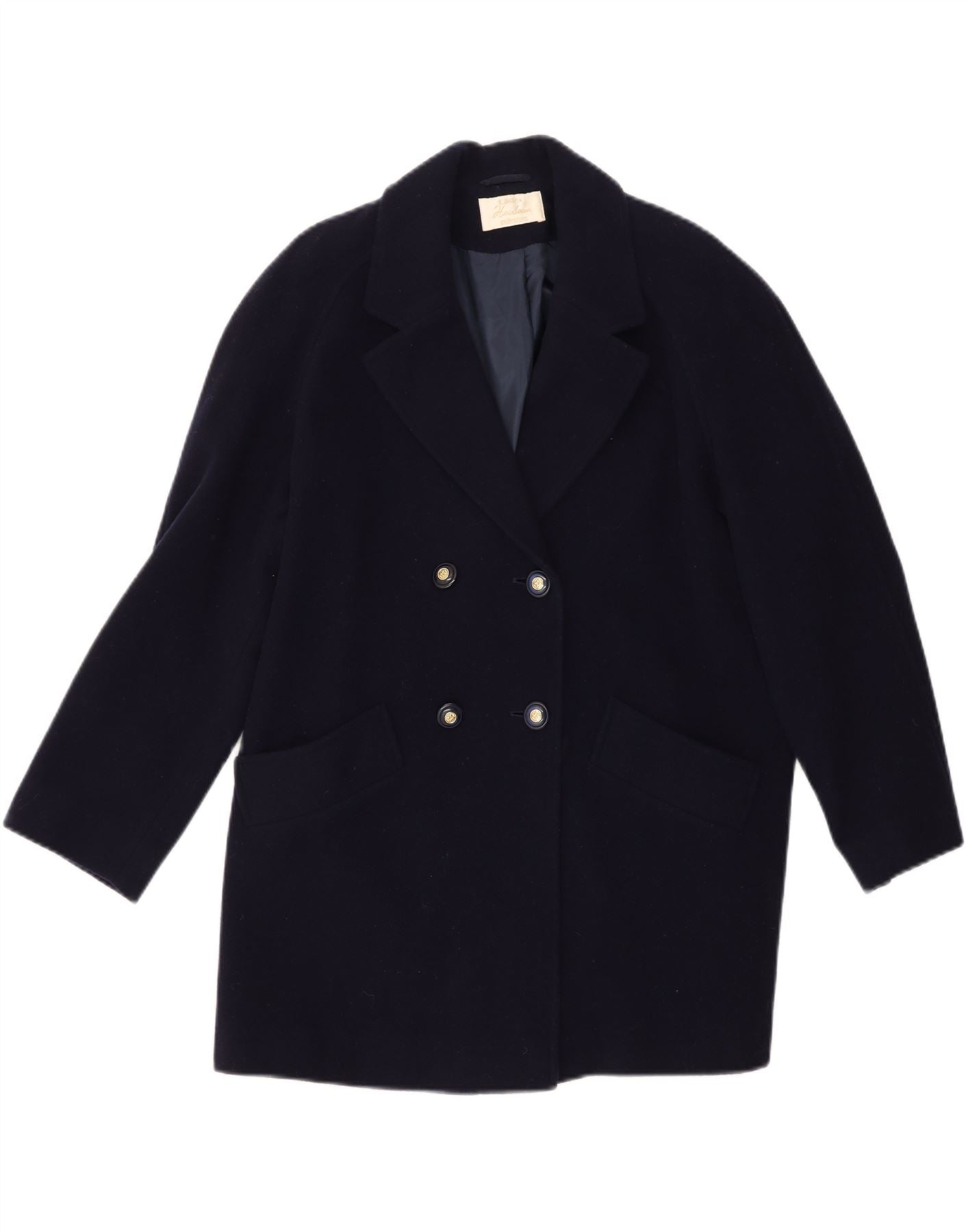 - AI Description: This Heirloom Collectibles womens pea coat is crafted from a rich navy blue woven wool fabric. It features a classic collared neckline and long sleeves. The double breasted front fastens with four prominent buttons. A regular fit ensures comfortable wear. Functional pockets add practicality and a refined finish. This timeless style offers warmth and sophistication.