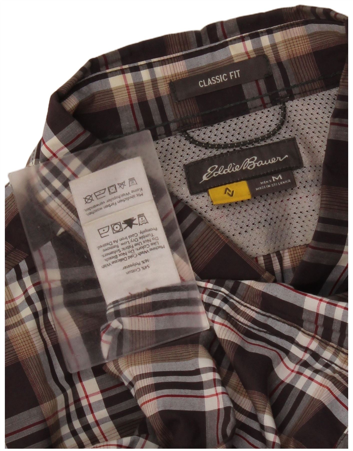 - AI Description: This Eddie Bauer mens shirt is crafted from a durable cotton blend fabric, featuring a classic brown plaid pattern. The collared neckline and full button-up front offer a timeless look. Long sleeves finish with neat buttoned cuffs. A single chest pocket adds practical detail. Designed in a classic fit, it provides comfortable wear for everyday style.