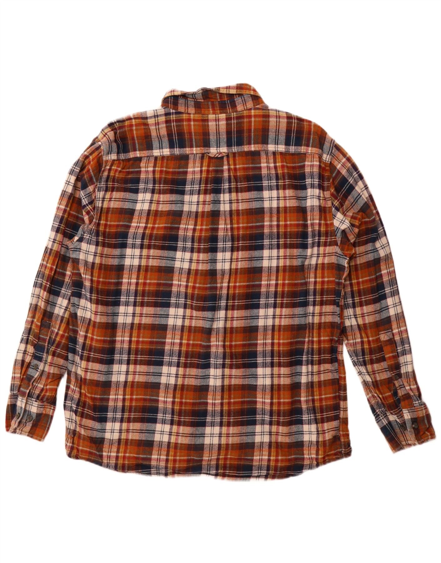- AI Description: This Eddie Bauer mens flannel shirt is crafted from soft 100 percent cotton flannel. It features a classic multicoloured plaid pattern in brown, orange, and navy blue. The collared neckline and full button-up front offer a timeless look. Long sleeves and a regular fit ensure comfort and ease of wear. A single chest pocket adds practical detail to this classic style.