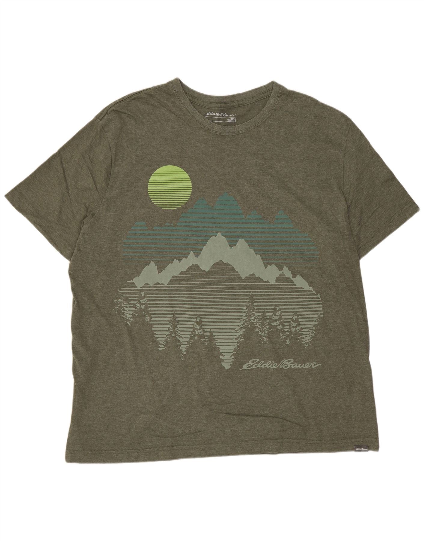 - AI Description: This Eddie Bauer mens graphic T-shirt is crafted from a comfortable green cotton blend jersey. It features a classic round neckline and short sleeves for a timeless look. The front showcases a striking nature illustration with mountains, trees, and a sun. This regular fit pullover offers lightweight comfort and breathability. The design is completed with a subtle Eddie Bauer logo.