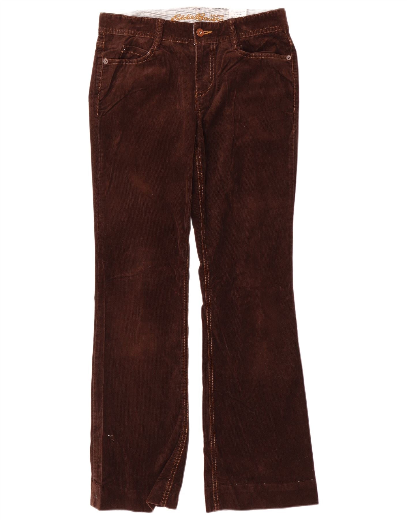 - AI Description: These Eddie Bauer womens Corduroy Trousers are crafted from rich brown corduroy, a blend of cotton, polyester, and spandex. They feature a classic mid-rise waist and a button closure. The regular fit offers comfort. A bootcut leg flares gently from the knee. Practical pockets are included. This design offers a timeless, classic style.