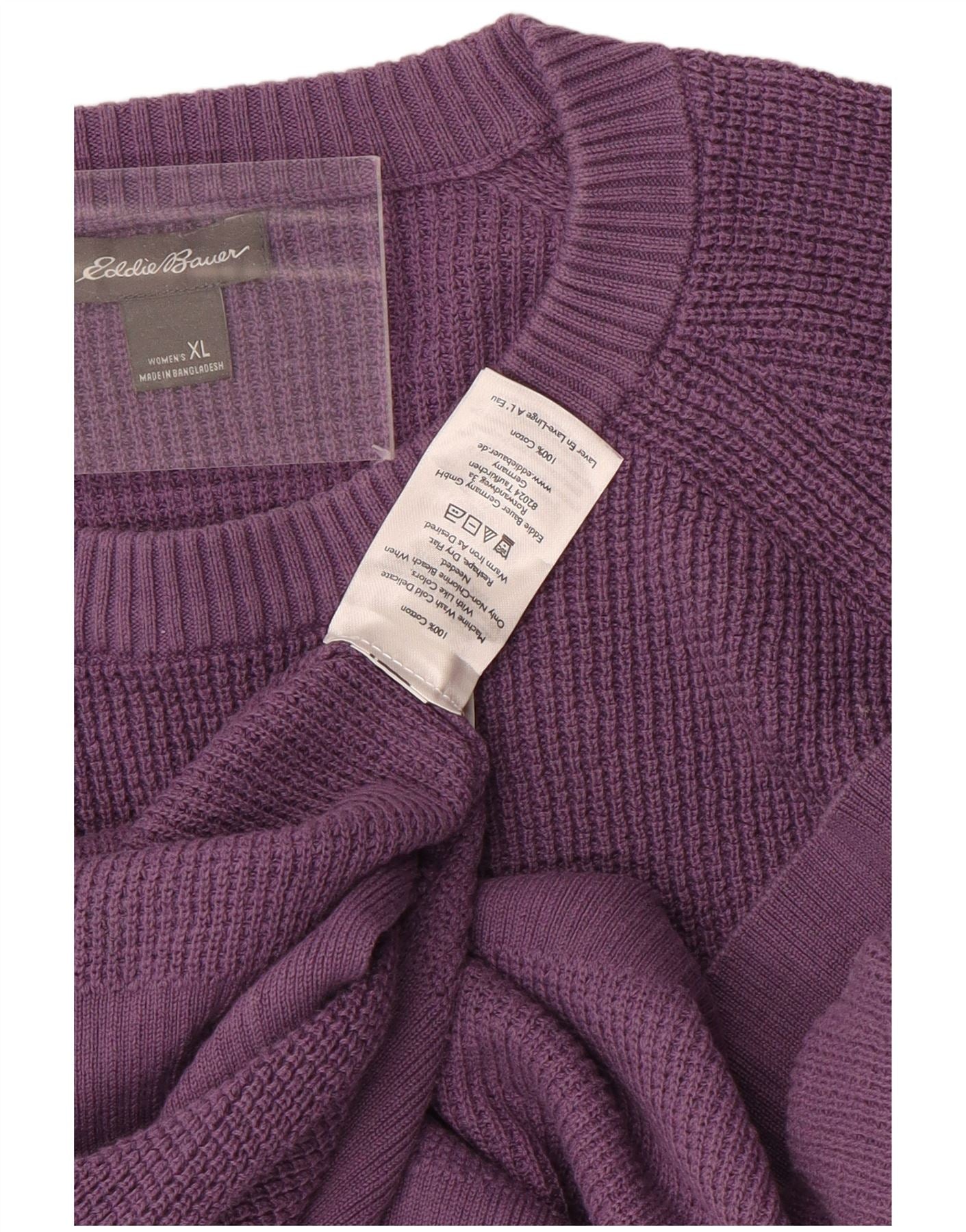 - AI Description: This Eddie Bauer womens crew neck jumper sweater is crafted from 100 percent cotton knit, offering a soft and comfortable feel. It comes in a rich purple hue. The round neckline and long sleeves provide a classic silhouette. Ribbed cuffs and hem ensure a neat finish. This pullover style offers a regular fit for everyday comfort. The plain knit design keeps it versatile and timeless.