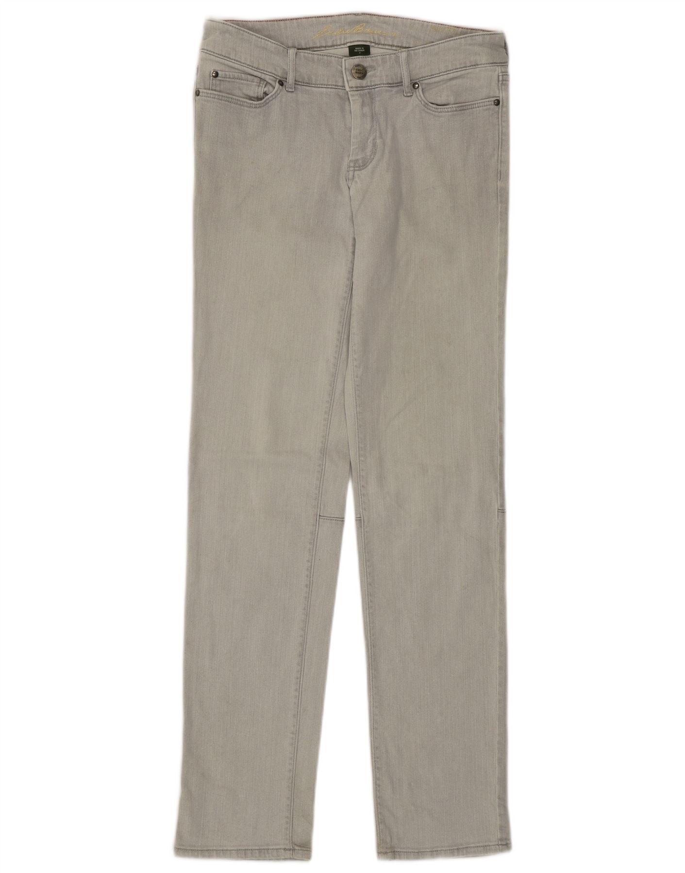 - AI Description: These Eddie Bauer women's slim jeans are crafted from grey denim with added stretch. The classic five-pocket style features a button closure. Their slim fit offers a streamlined silhouette. These jeans provide both comfort and a timeless aesthetic. Made in Sri Lanka.
