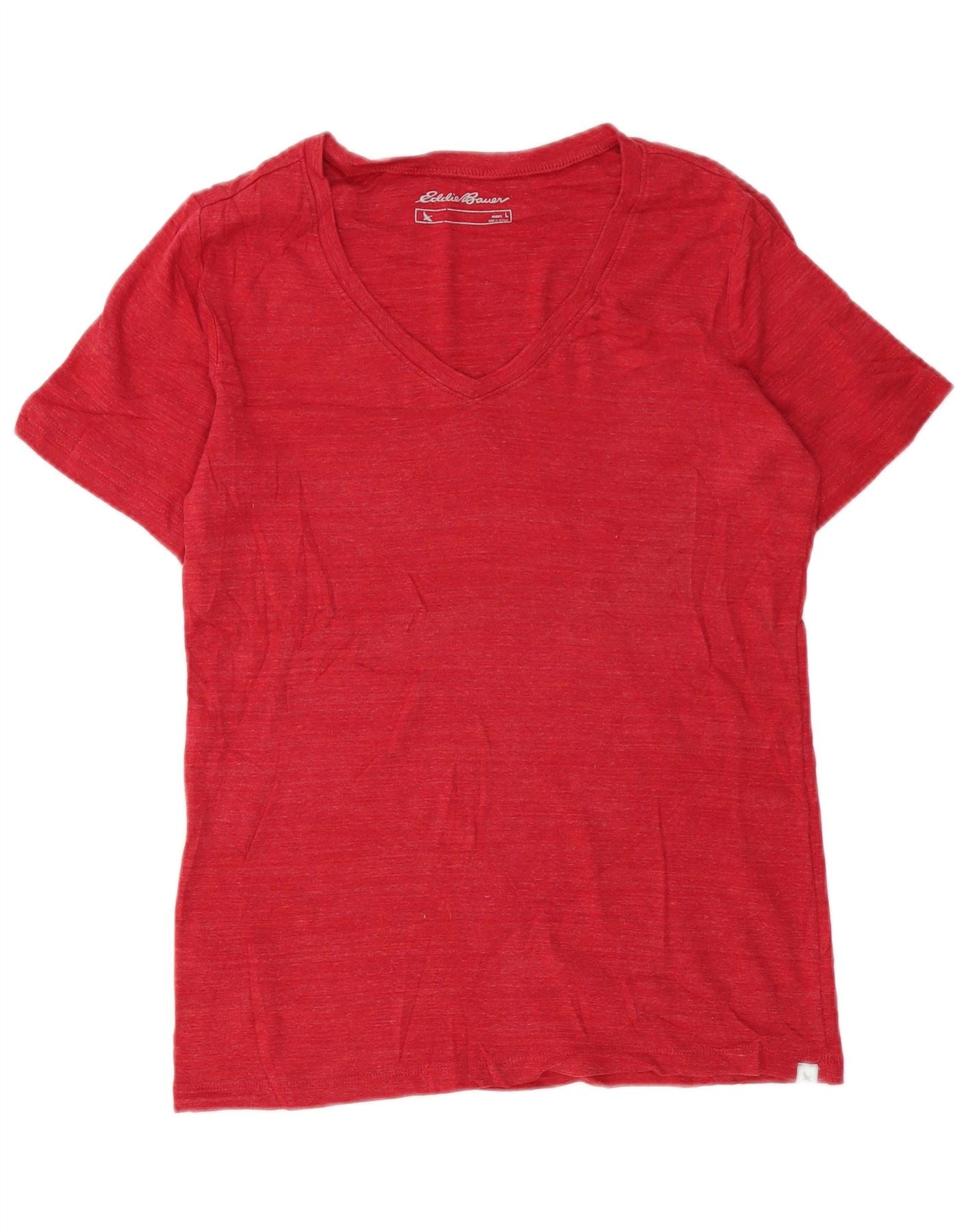 - AI Description: This Eddie Bauer womens T-shirt is crafted from lightweight red cotton jersey. It features a classic V-neckline and short sleeves for a comfortable fit. The regular fit ensures ease of movement and a relaxed silhouette. A subtle branded logo adds a touch of signature detailing. This versatile top offers both comfort and style for everyday wear.