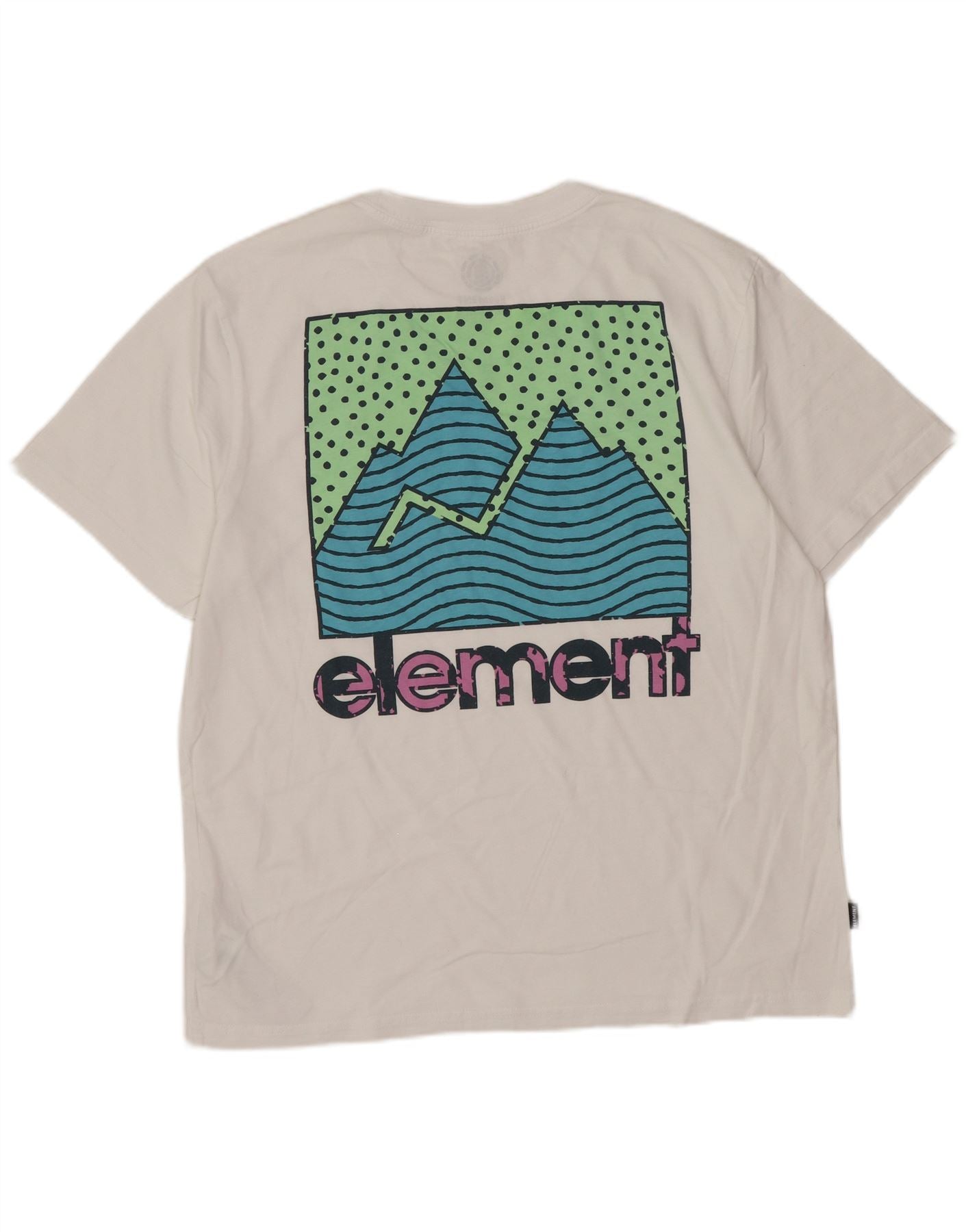 - AI Description: This Element mens graphic T-shirt is crafted from soft white organic cotton jersey. It features a classic round neckline and short sleeves for a comfortable fit. The pullover style offers easy wear. A small logo patch adorns the front chest. The back showcases a vibrant graphic print with mountains and waves, adding a distinctive visual element. Its regular fit ensures a relaxed, breathable feel.