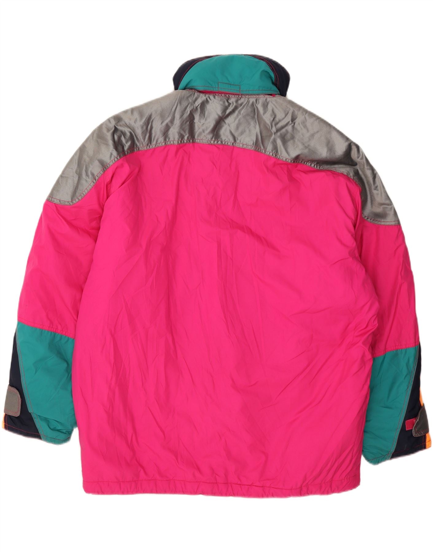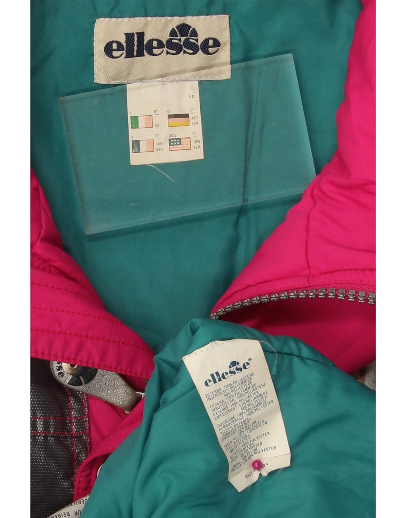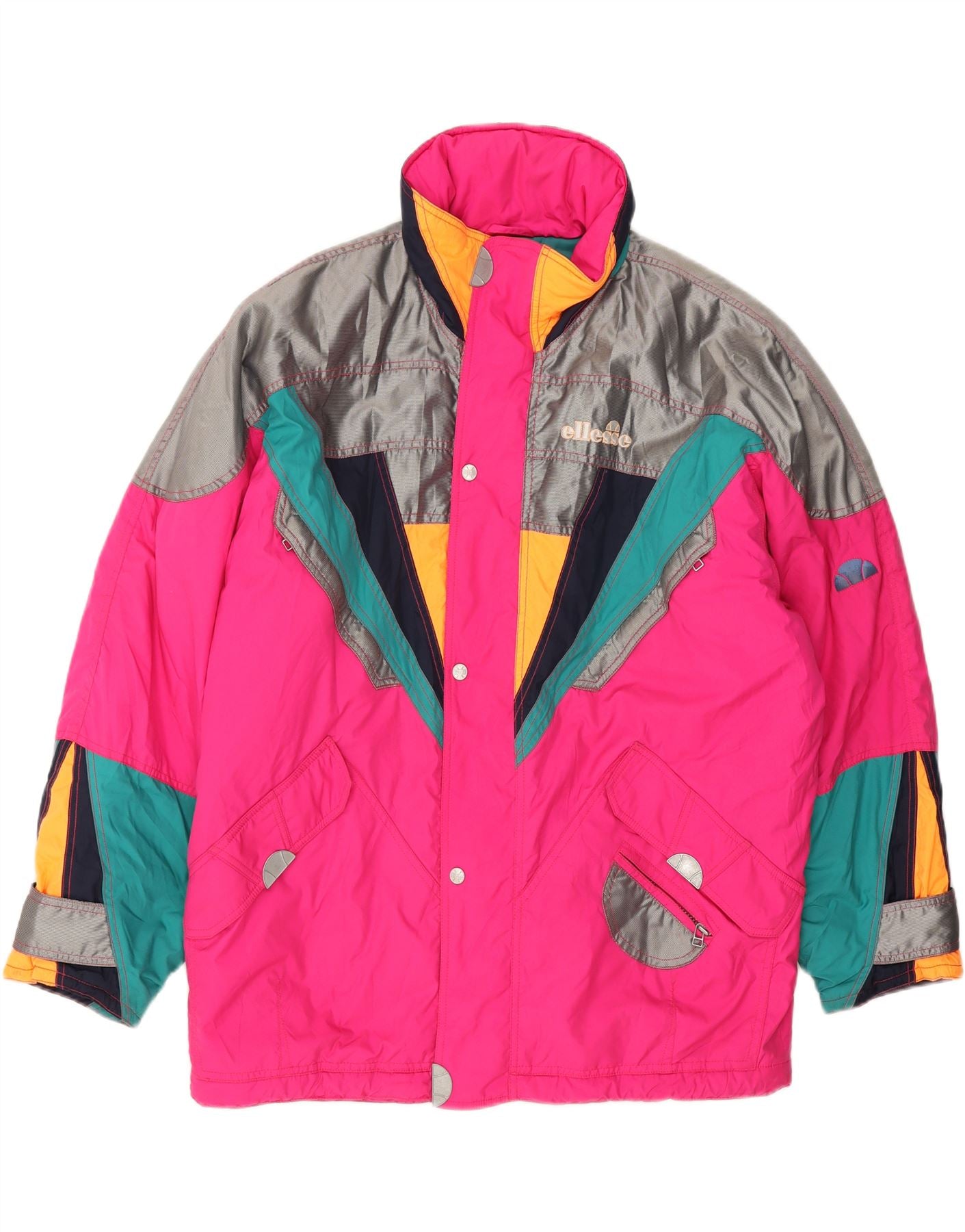 - AI Description: This pre-owned Ellesse men's jacket boasts an 80s style with a colourblock pattern. The regular fit, pink woven jacket features long sleeves, a collared neckline, and a zip closure. Accented with a logo, it includes practical pockets and zipped pockets. The padded jacket is made from polyester, with a padded fabric fit and feature type. In excellent condition.