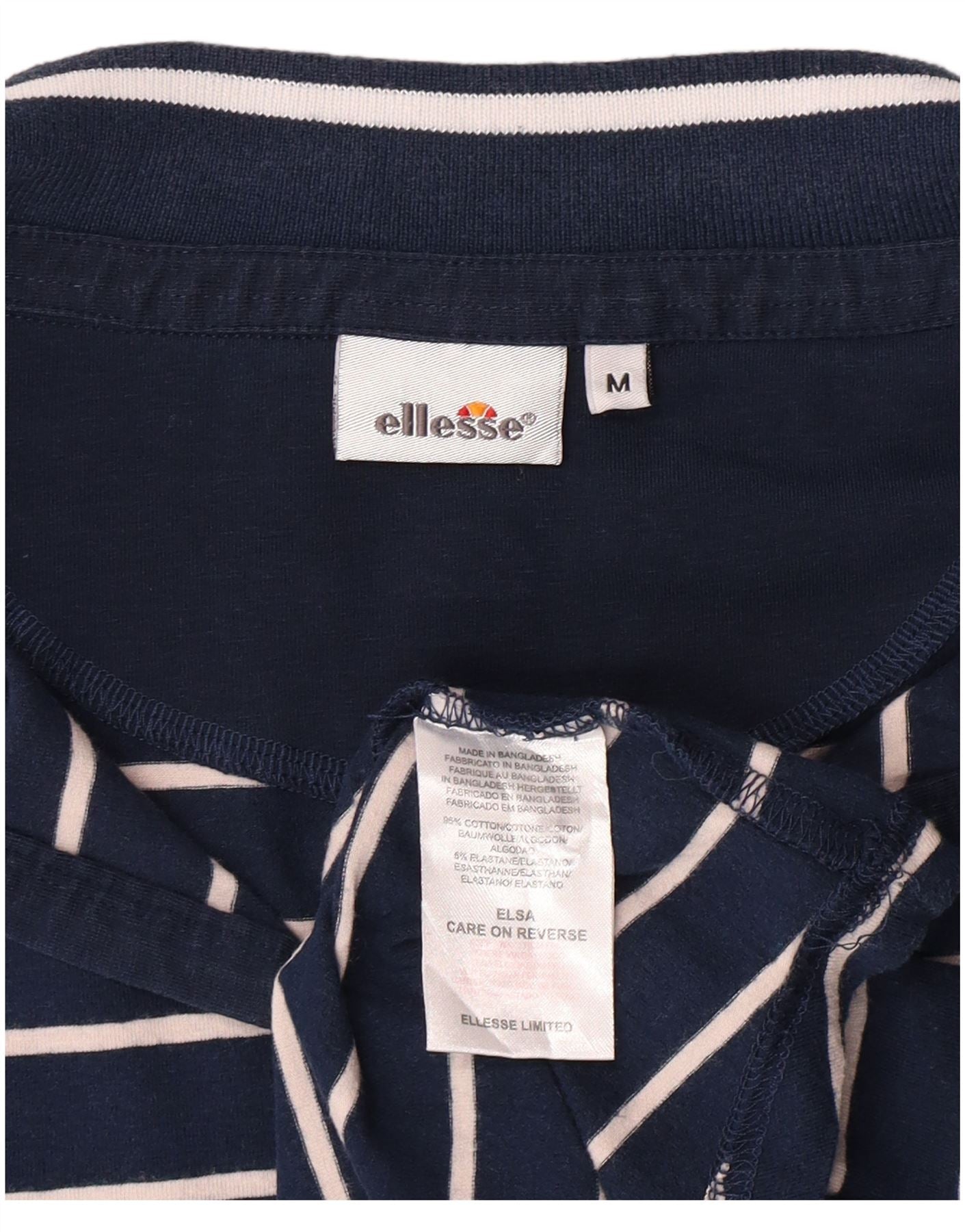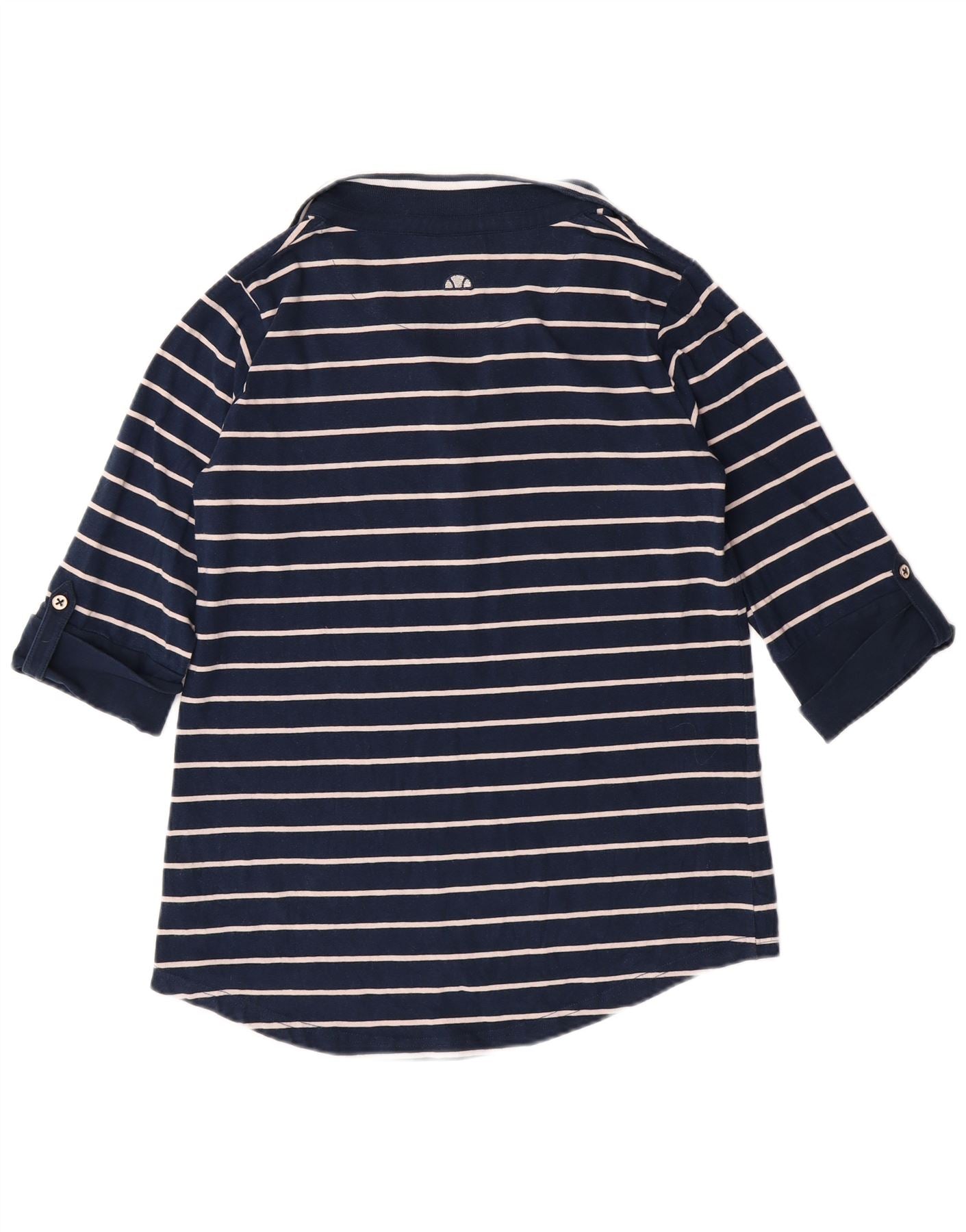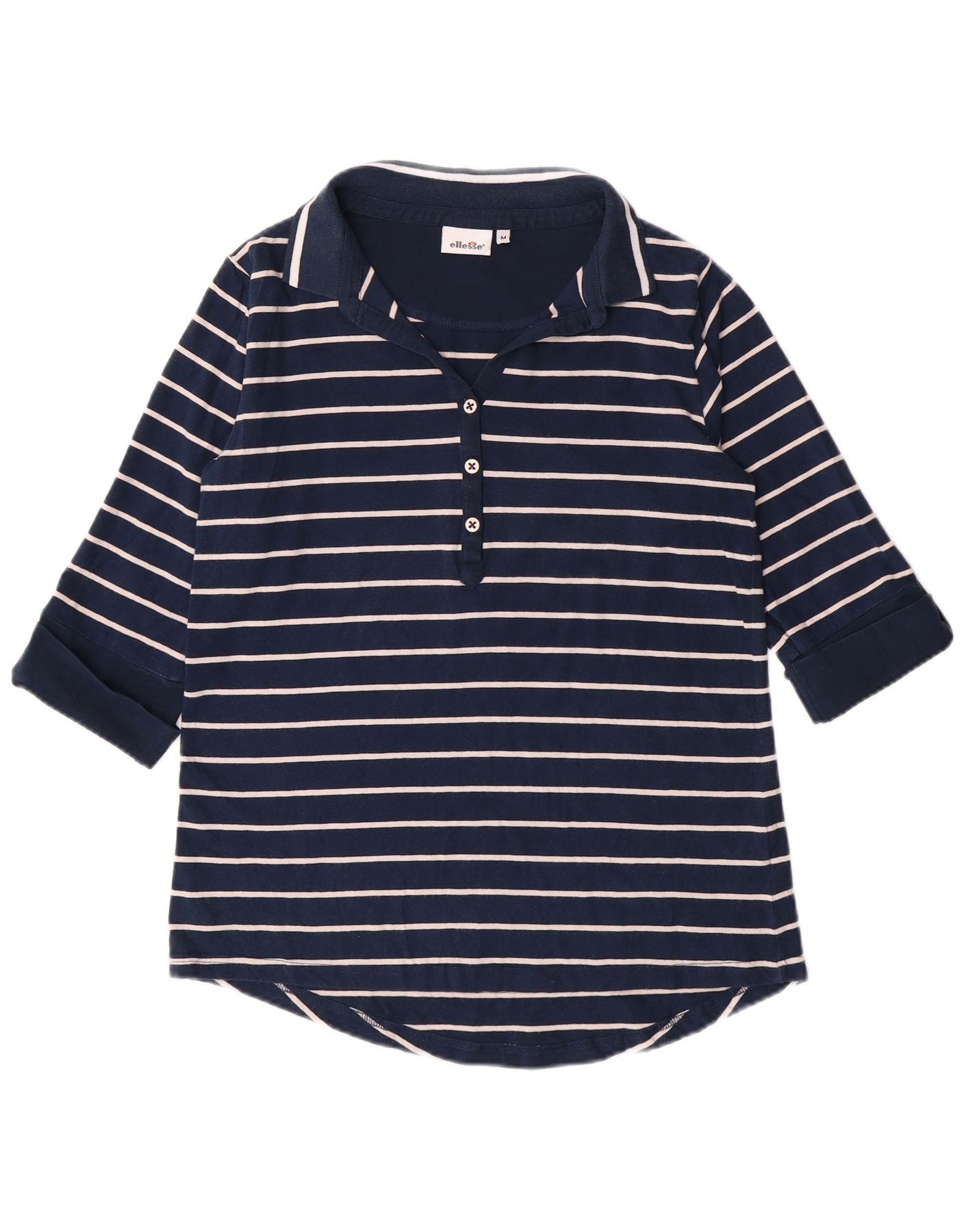 ELLESSE Womens 3/4 Sleeve Polo Shirt UK 12 Medium Navy Blue Striped Cotton