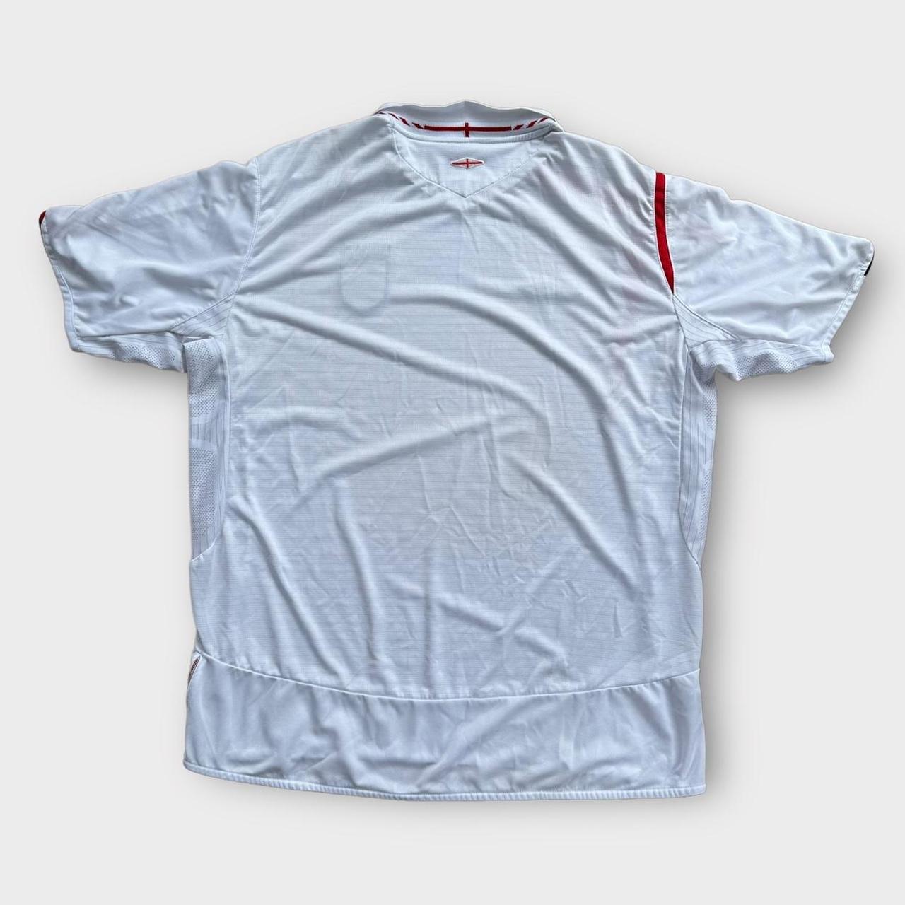 Classic England home football shirt by Umbro in white and red with embroidered logos on the chest