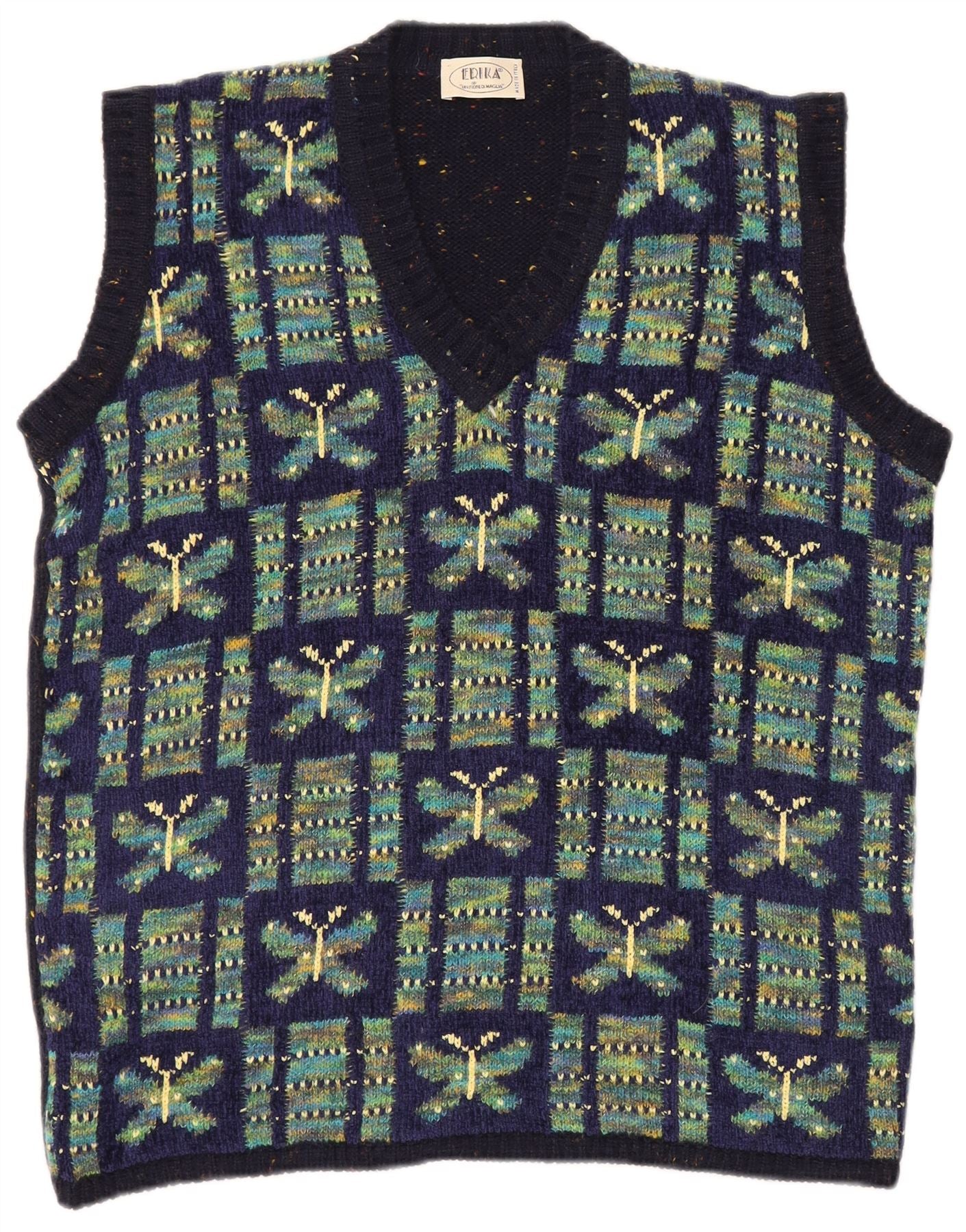 - AI Description: This Erika mens vest tank top is crafted from a rich wool blend knit, featuring a navy blue base. It showcases a striking butterfly animal print in shades of green and blue. The V-neckline and sleeveless design offer a classic, comfortable fit. Its regular cut ensures ease of wear, making it a distinctive layering piece.