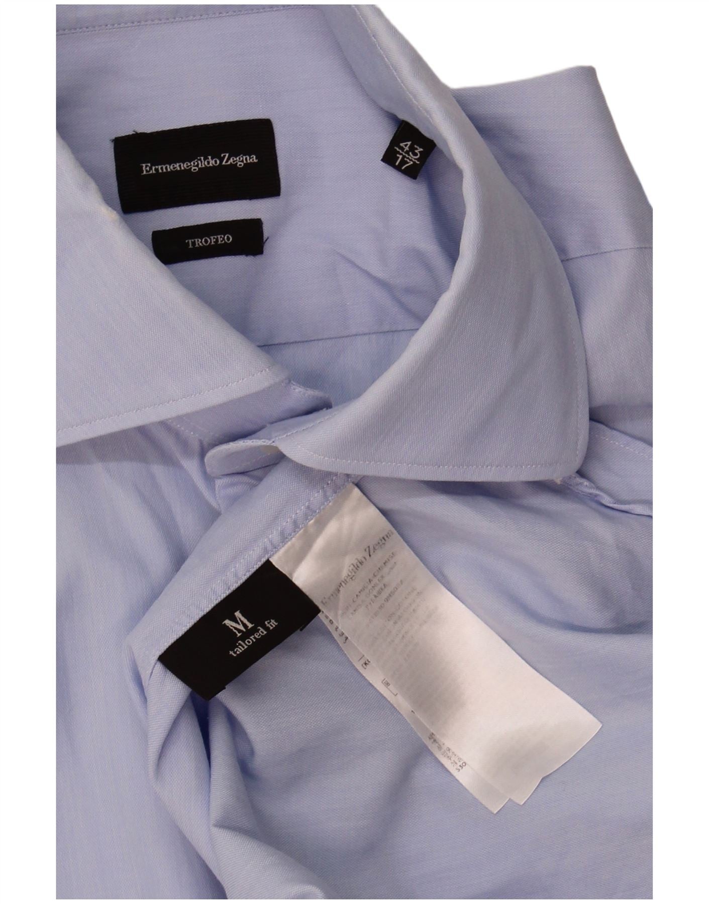 - AI Description: This Ermenegildo Zegna mens formal shirt is crafted from 100 percent woven cotton, offering a crisp, smooth texture. Its refined blue hue presents a clean, pattern-free design. The collared neckline and long sleeves define its classic structure. A full button-up front ensures a polished look. Designed for a slim fit, it provides a sharp, contemporary silhouette. Tonal buttons complete the sophisticated aesthetic.