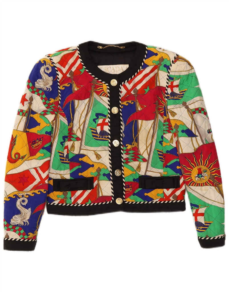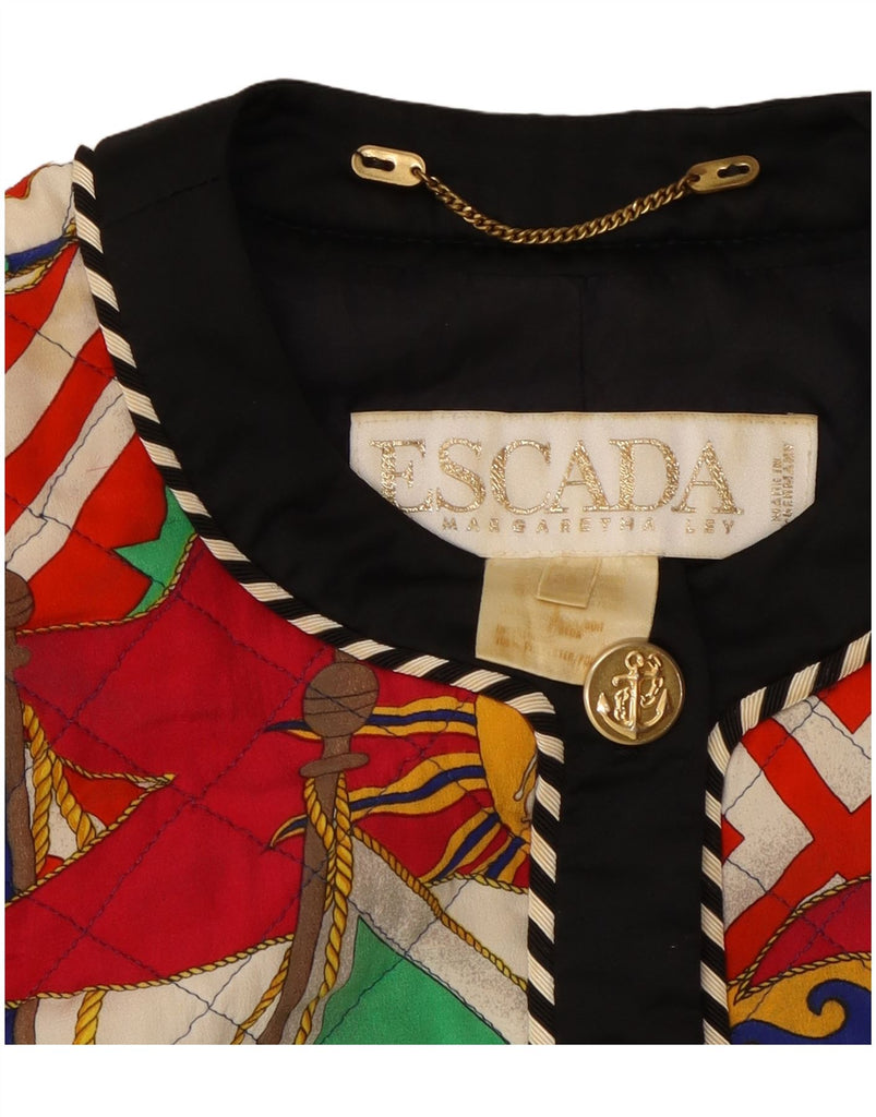 - AI Description: This Escada womens quilted jacket features a vibrant multicoloured woven fabric with a quilted finish. The abstract pattern creates a striking visual. Tonal buttons secure the front closure. It has a classic round neck and long sleeves. The regular fit offers comfortable wear. Fully lined for added comfort and warmth, it embodies a nautical style, perfect for a sophisticated look.