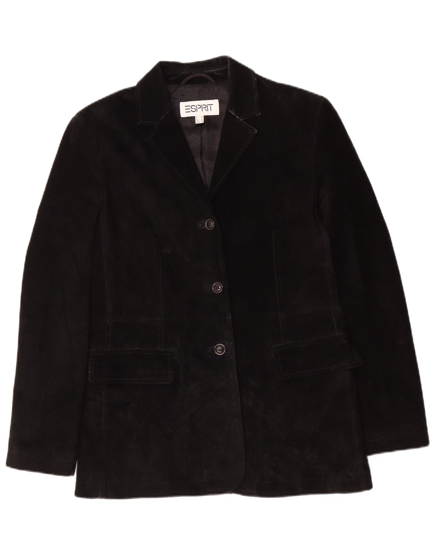 - AI Description: This Esprit womens blazer jacket is crafted from luxurious black suede leather. It features a classic collared neckline and a three-button front closure for a refined look. Long sleeves and a regular fit ensure comfortable wear. Two subtle front pockets add practical detail. This timeless piece offers sophisticated style and a soft, tactile finish.