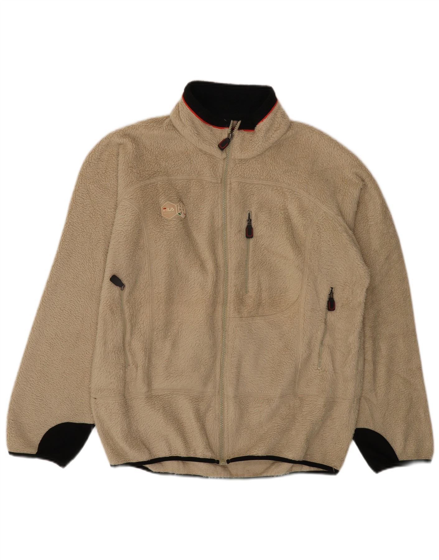 - AI Description: This Fila mens tracksuit top jacket is crafted from soft beige polyester fleece, offering thermal warmth and a lightweight feel. It features a collared neckline and a full zip closure for versatile wear. Long sleeves provide ample coverage. Zipped pockets add practical storage. The regular fit ensures comfortable movement. Black trim accents the collar and cuffs, completing the sporty design.
