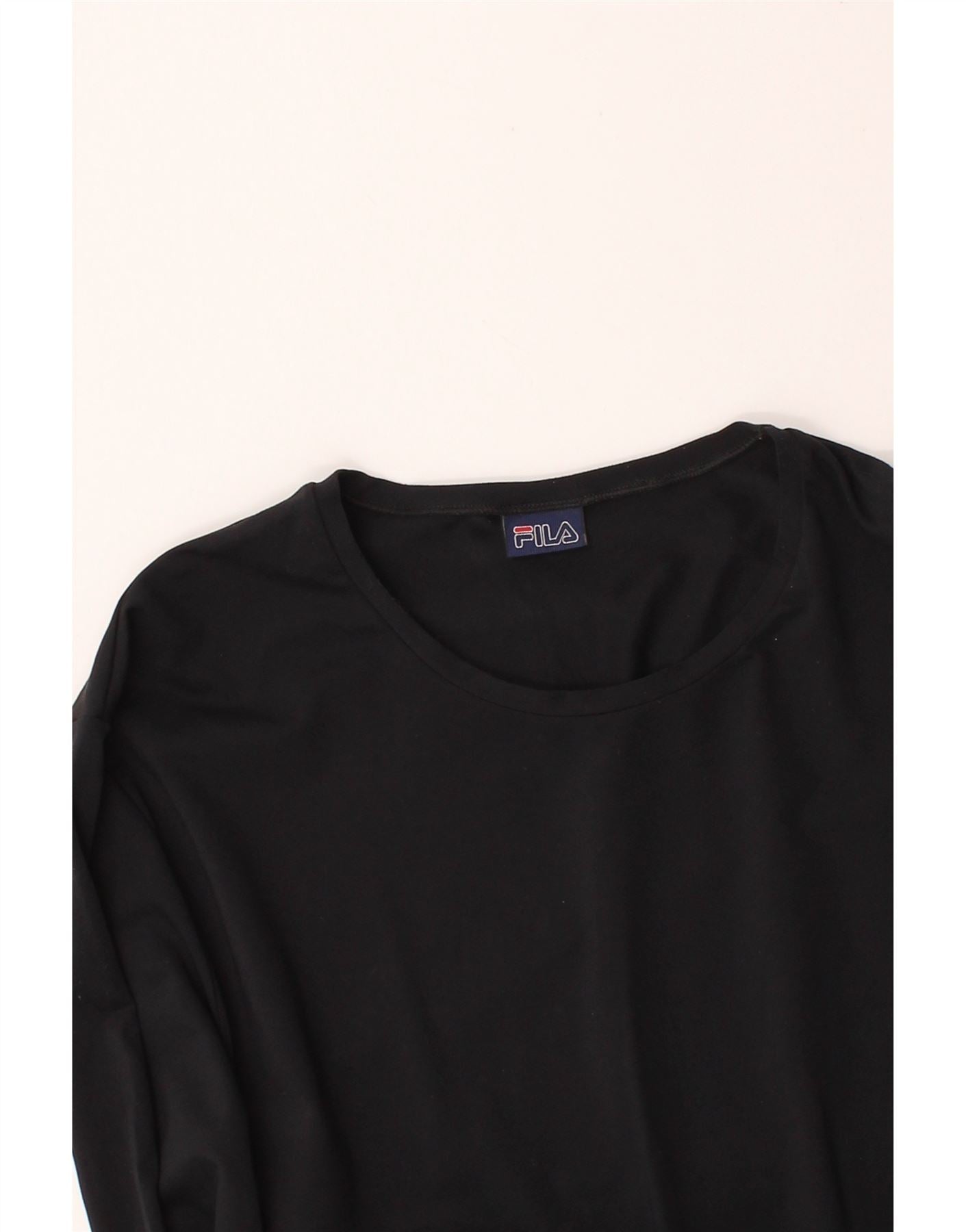 - AI Description: This pre-owned Fila T-shirt top is a classic addition to any woman's wardrobe. Crafted in black knit fabric, it features a comfortable regular fit, round neck, and long sleeves. The pull-on closure ensures easy wear. A subtle logo accent adds a touch of brand recognition. This T-shirt is in excellent condition and ideal for everyday styling. Recommended retail price: £20.00.