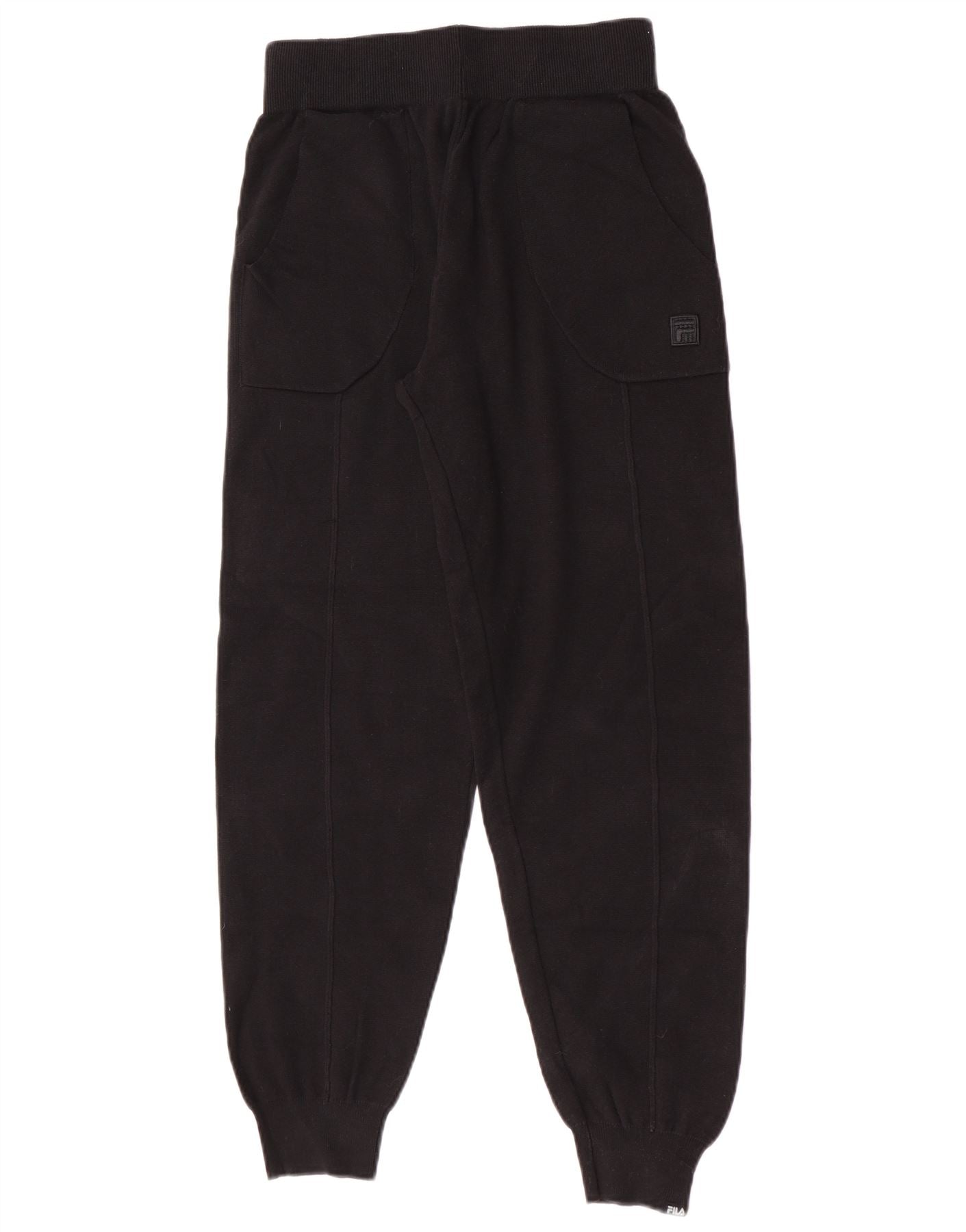 - AI Description: This Fila womens tracksuit trousers joggers are crafted from soft black 100 percent cotton knit fabric. They feature a comfortable pull on elastic waist for an easy fit. The regular fit design includes practical pockets and cuffed ankles for a classic jogger silhouette. A subtle Fila logo detail adds a signature touch to this versatile sports style.