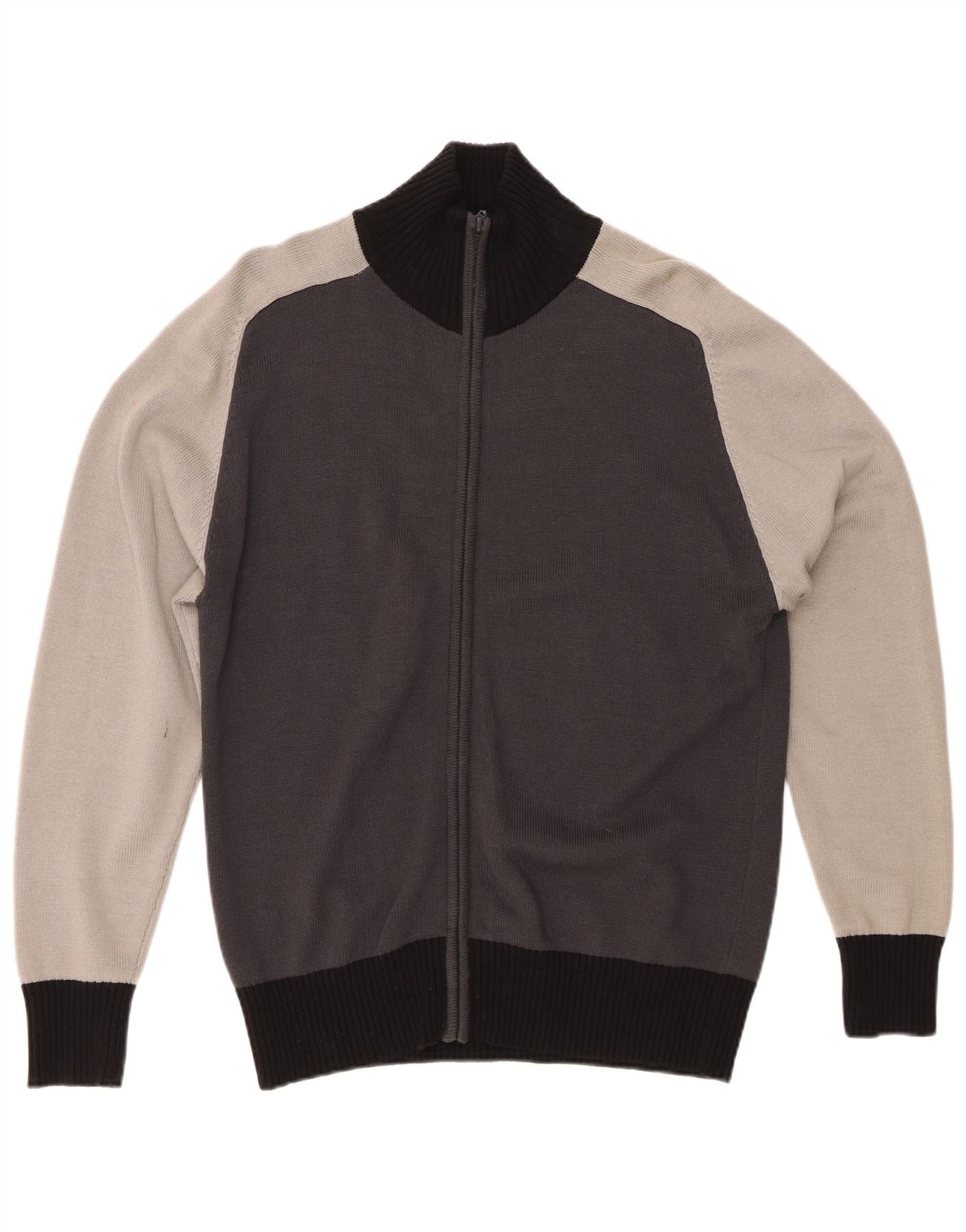 - AI Description: This Fishbone mens cardigan sweater is crafted from a comfortable knit fabric. It features a modern colourblock pattern in multicoloured tones, including black, grey, and off white. The mock neck and full zip closure offer versatile styling. Long sleeves and a regular fit ensure comfort and a classic silhouette. This piece combines contemporary design with everyday wearability.