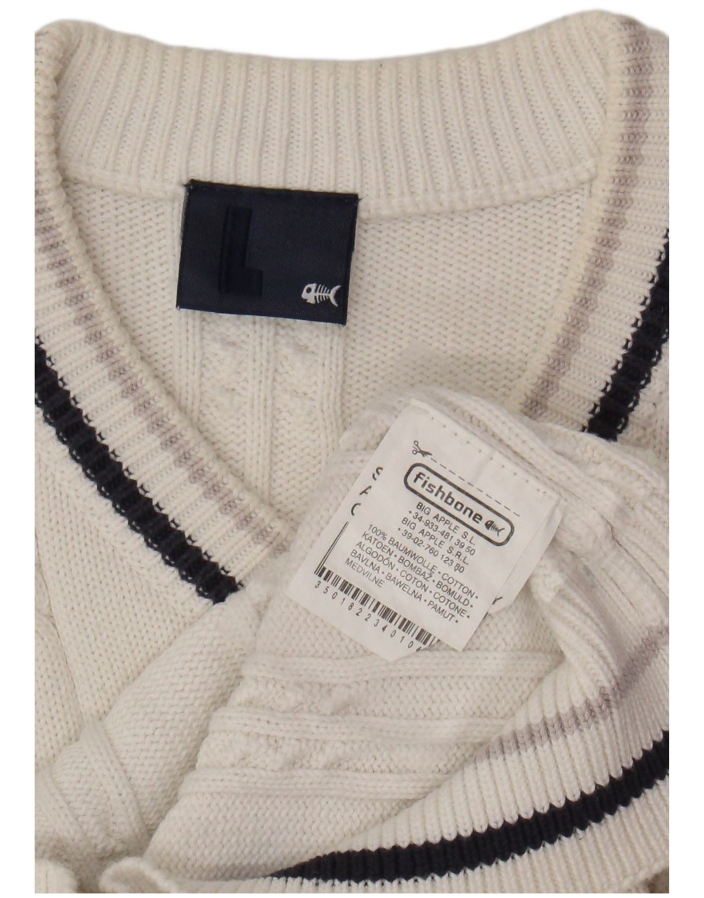 - AI Description: This Fishbone men's sweater is crafted from knitted cotton in a striped pattern. The sleeveless design and V-neck offer a preppy, casual style. Its regular fit ensures comfort and ease of movement. The pullover closure maintains a clean, streamlined look. Perfect for layering or wearing on its own.