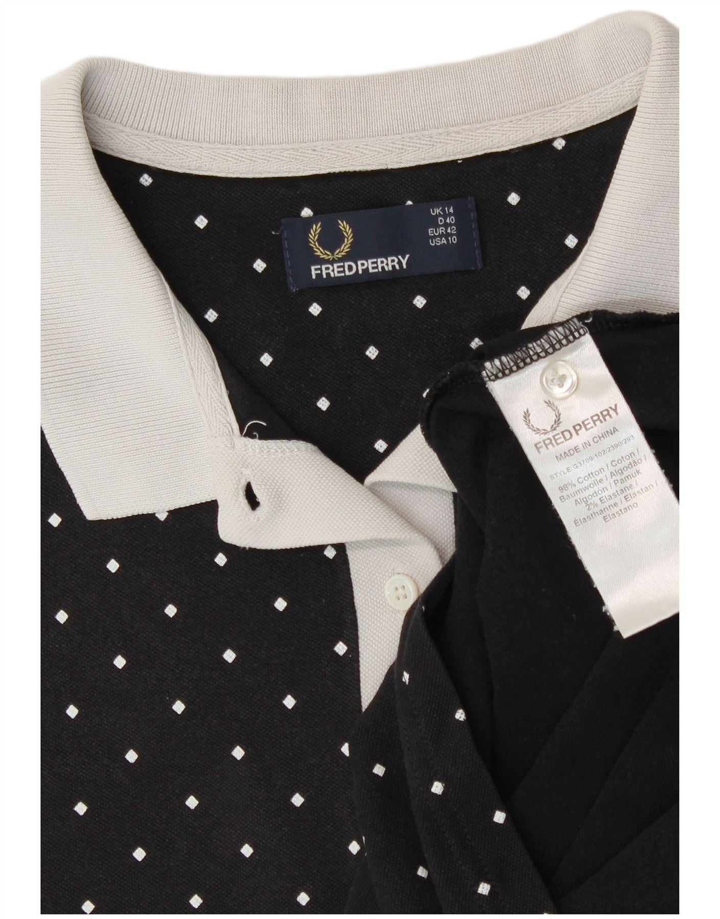 - AI Description: This Fred Perry womens polo shirt is crafted from soft black cotton jersey with added stretch. It features a classic white polka dot pattern throughout. The collared neckline and short sleeves are trimmed in contrasting white. A three-button placket and embroidered logo complete the design. The regular fit ensures comfortable wear and a timeless silhouette.