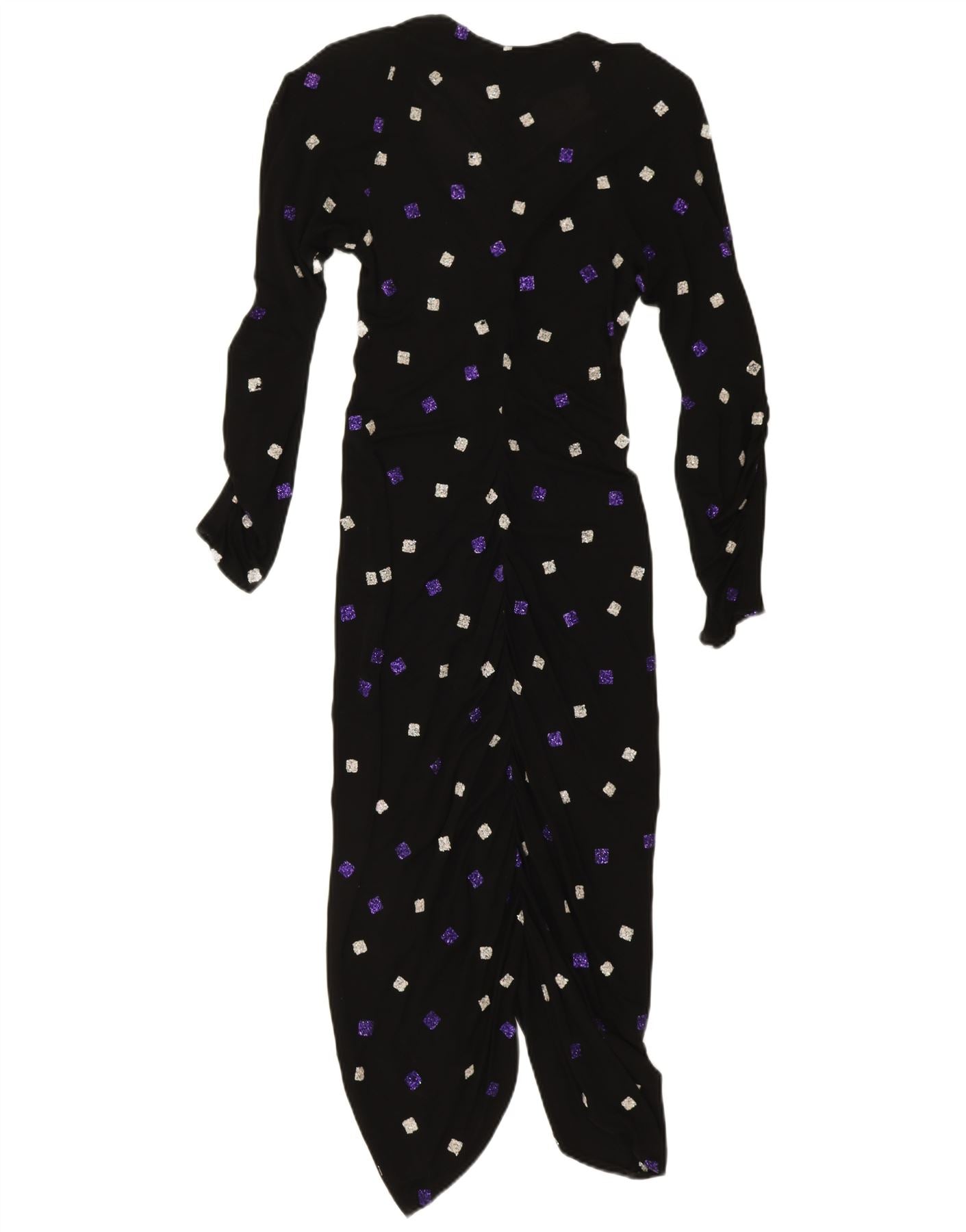 - AI Description: This Funky womens wrap dress is crafted from black jersey fabric. It features a striking geometric pattern of glitter and sequin squares. The V-neckline and long sleeves offer a classic silhouette. Designed with a regular fit, it drapes elegantly. The pullover style ensures ease of wear. This retro-inspired piece combines comfort with eye-catching sparkle.