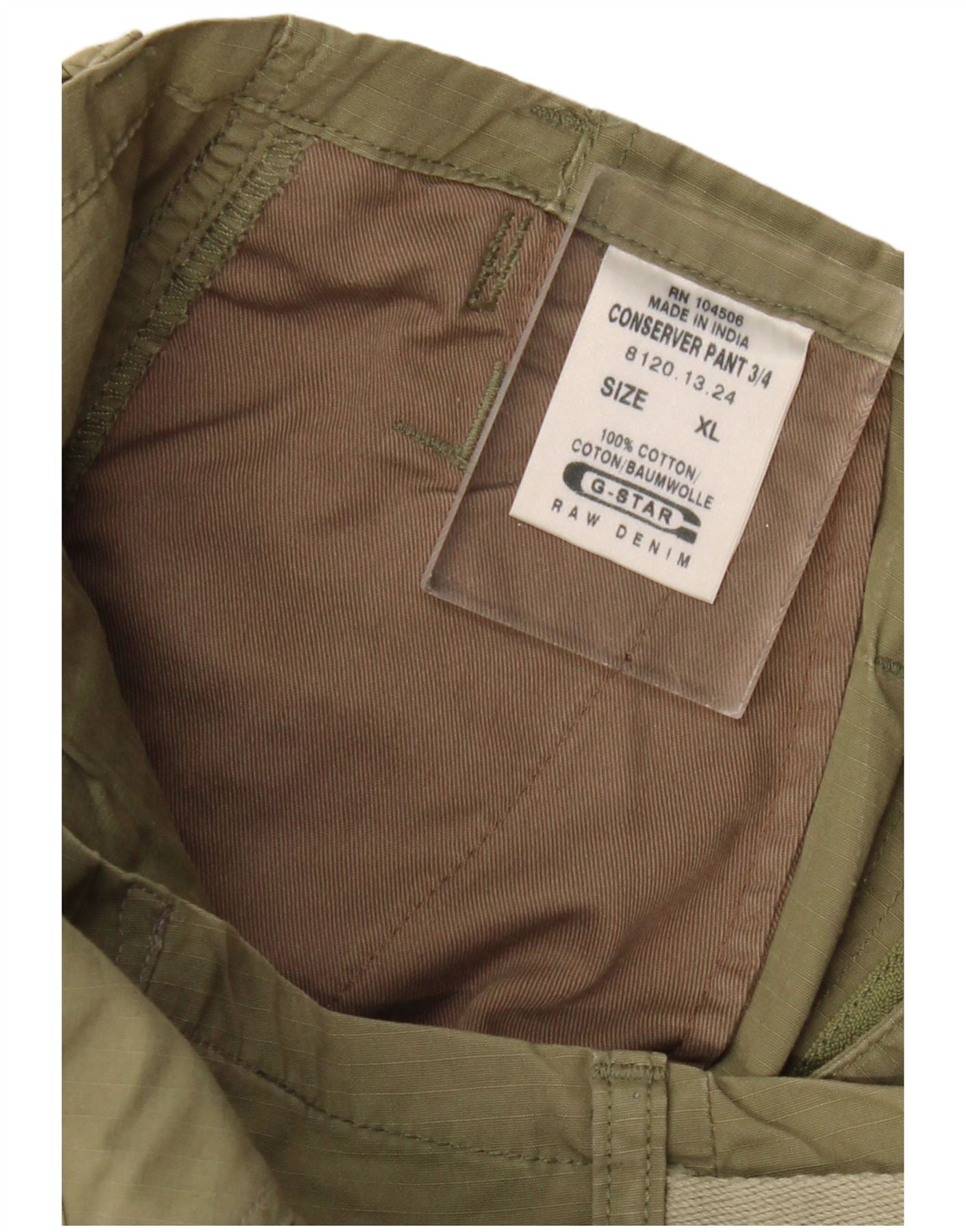- AI Description: This G-Star Raw mens Capri trousers are crafted from durable khaki woven cotton. They feature a relaxed fit and a button closure for comfort. Cargo pockets on the sides add practical detailing. The adjustable waist with buckle accents ensures a custom fit. Cuffed hems complete the casual, army-inspired style.