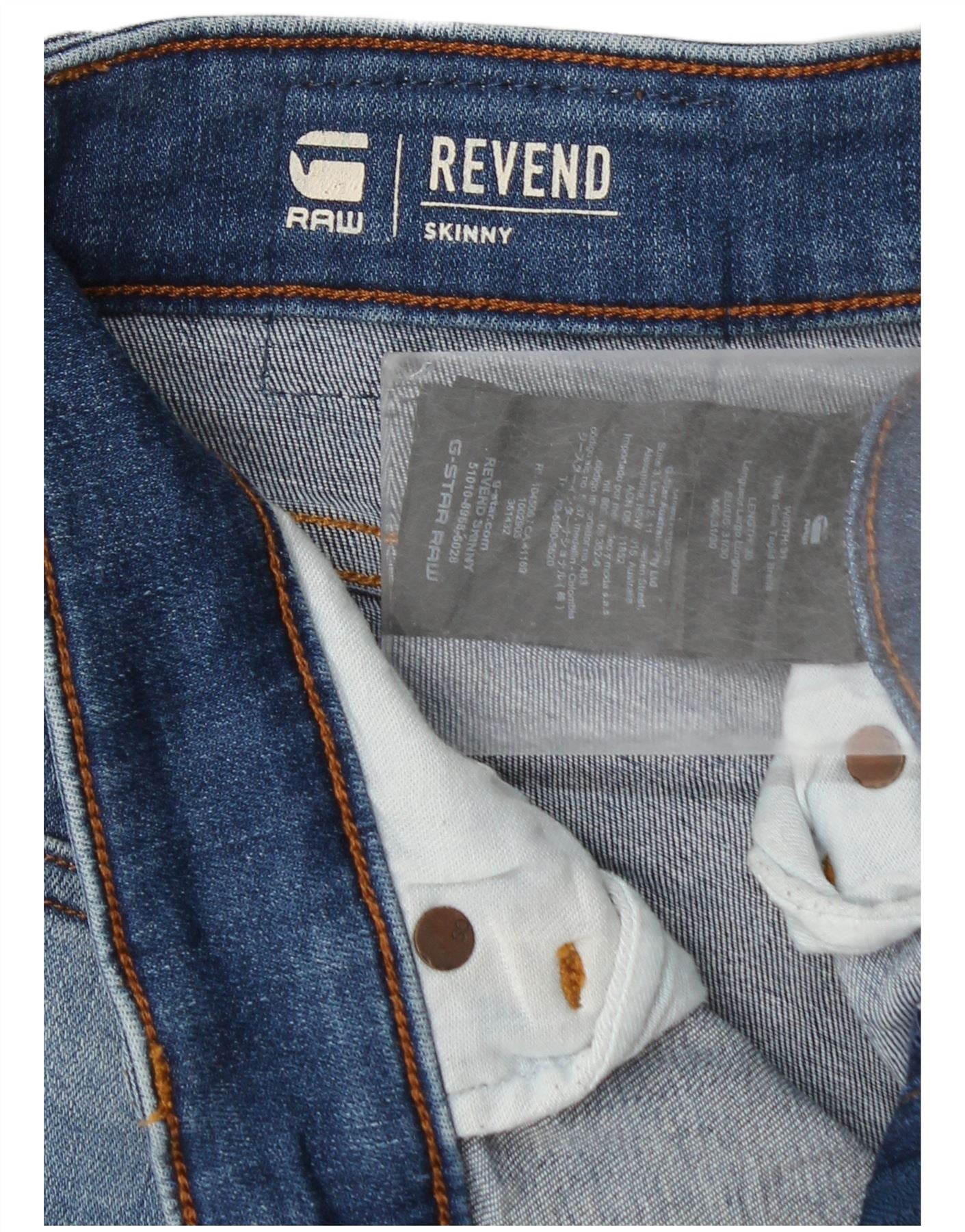 - AI Description: This G-Star Raw men's Revend Skinny jeans are crafted from blue denim with a comfortable stretch. The extra-slim fit hugs the leg from hip to ankle, creating a modern silhouette. A button closure secures the waist, complemented by functional pockets. Subtle logo detailing adds a signature touch. This design offers both style and ease of movement.