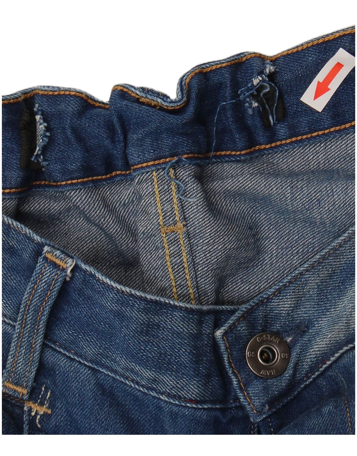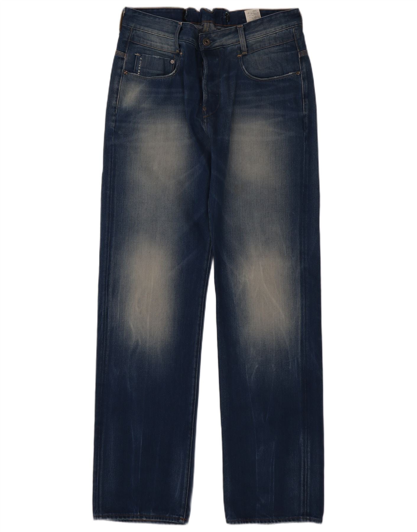 - AI Description: These G-Star mens straight jeans are crafted from blue denim with a modern distressed finish. They feature a classic straight fit through the leg for a comfortable silhouette. The button closure ensures a secure fit. Practical pockets are included, alongside a distinctive branded logo accent. This design offers a contemporary yet timeless appeal.