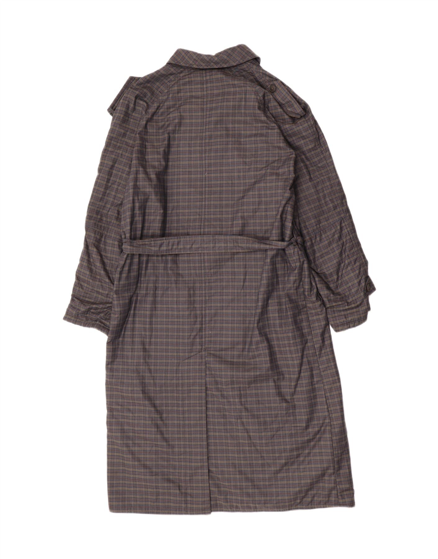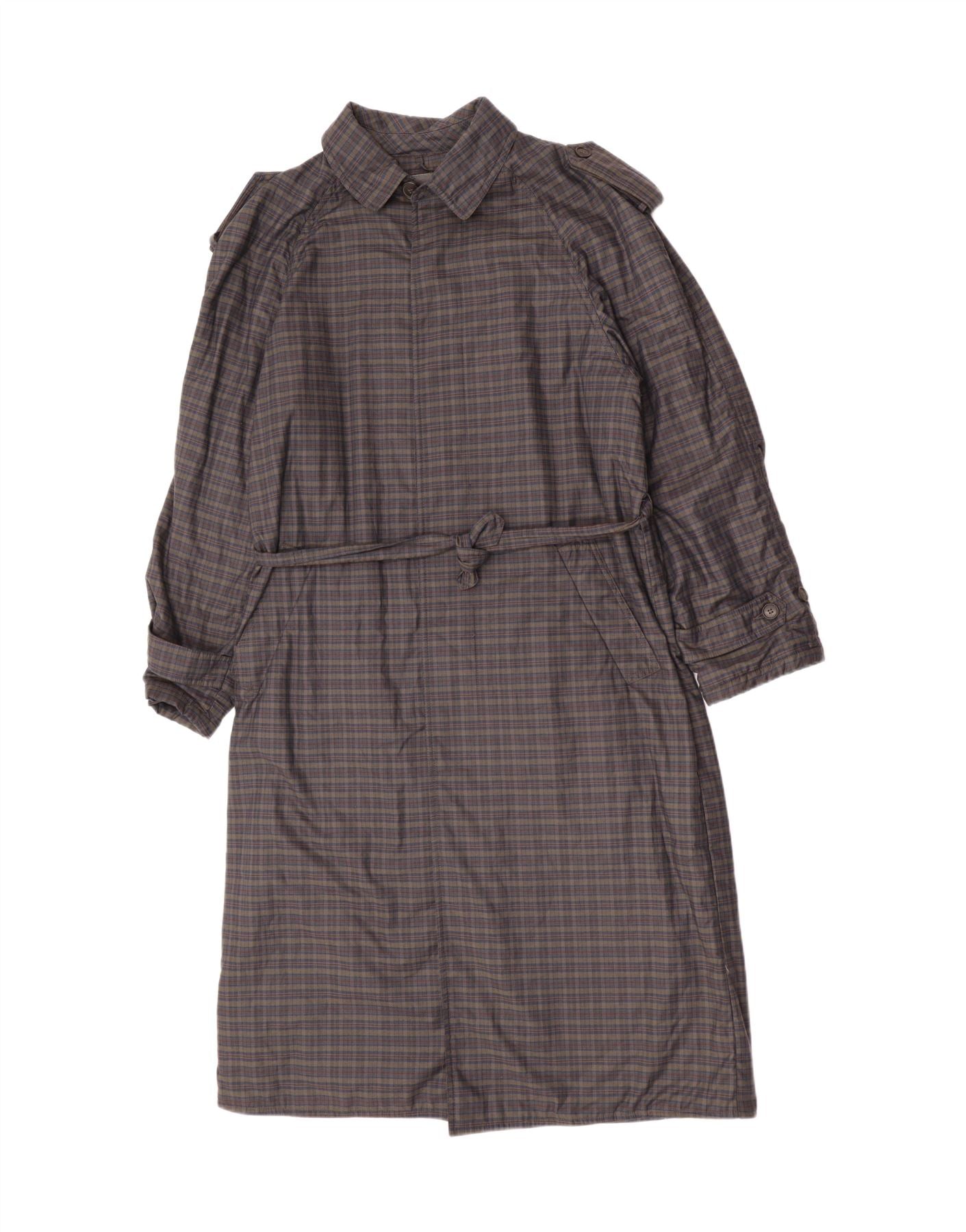- AI Description: This Vintage mens trench coat features a classic grey check woven fabric. The collared neckline and button closure offer a timeless, refined look. Long sleeves and a regular fit provide comfortable wear. It includes practical pockets and a belted waist for adjustable shaping. The check pattern adds subtle visual depth to this sophisticated outerwear piece.