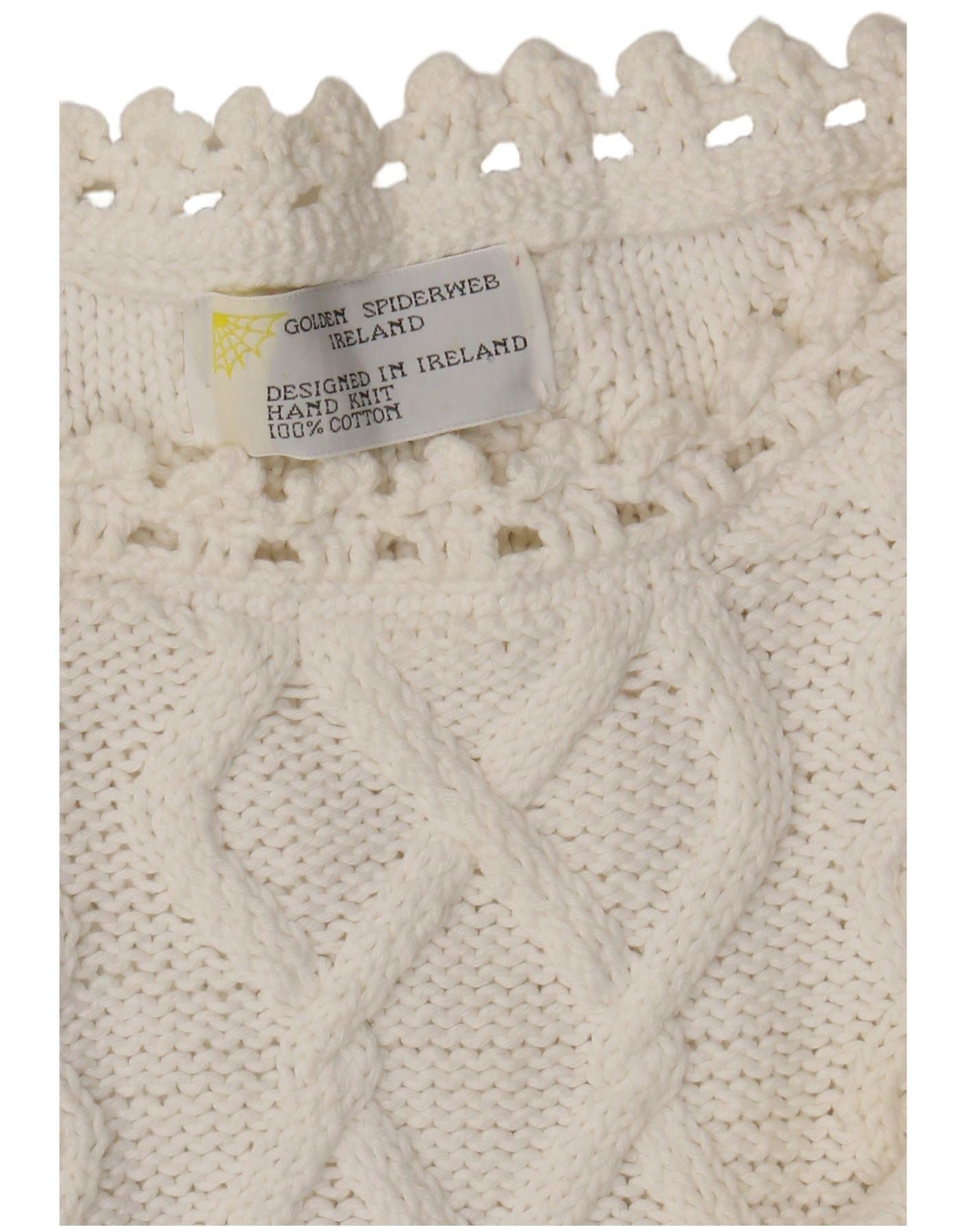 - AI Description: This Golden Spiderweb womens crew neck jumper sweater is crafted from soft, hand-knit 100 percent cotton. Its white knit features intricate cable patterns throughout. The round neckline is adorned with delicate crochet trim, adding a charming detail. Long sleeves finish with comfortable cuffs. A lovely crochet ruffle edges the hemline. The regular fit offers a classic, relaxed silhouette, ensuring both comfort and breathability.