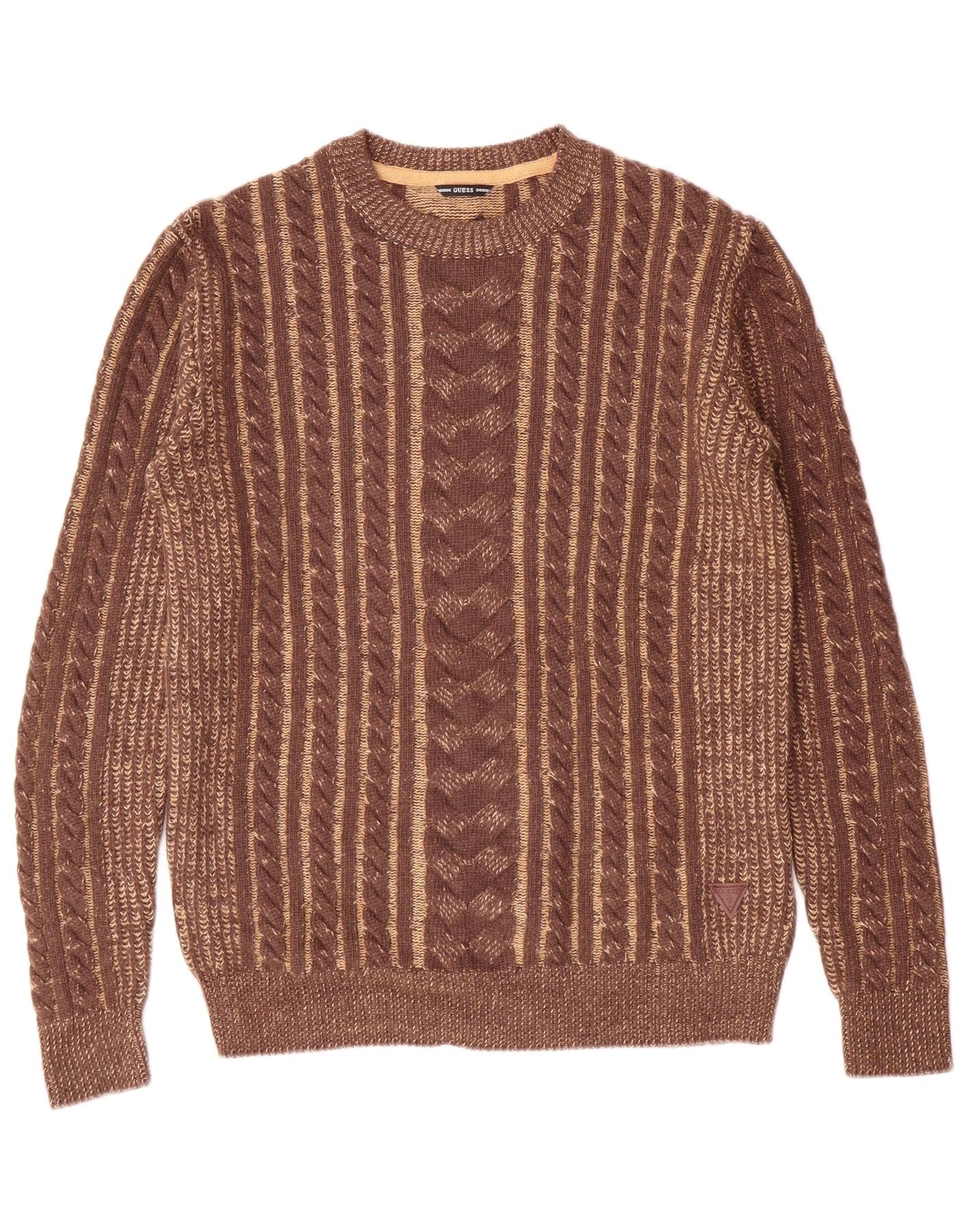 GUESS Mens Crew Neck Jumper Sweater Small Brown Polyamide