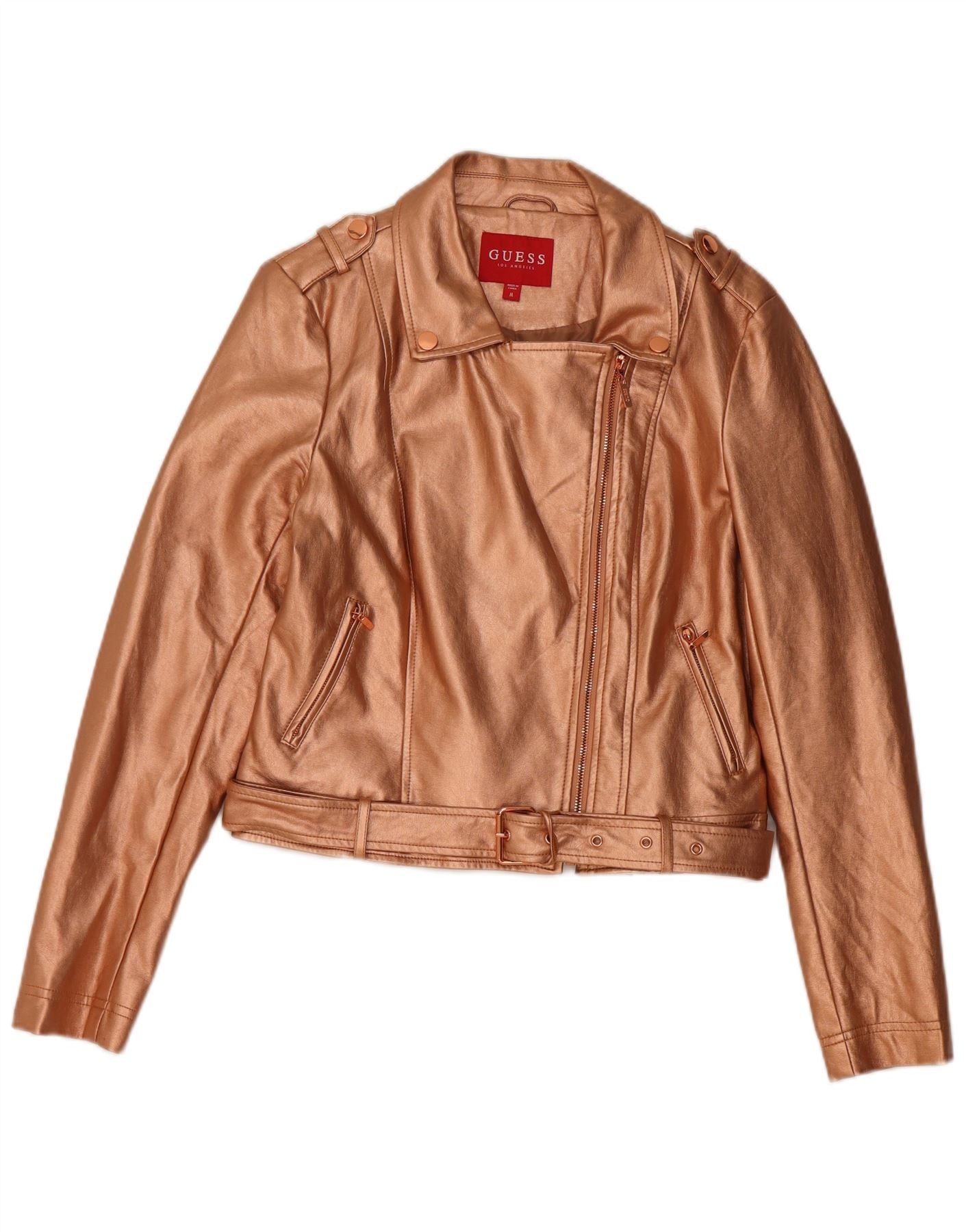 GUESS Womens Crop Faux Leather Biker Jacket UK 12 Medium Gold Polyurethane