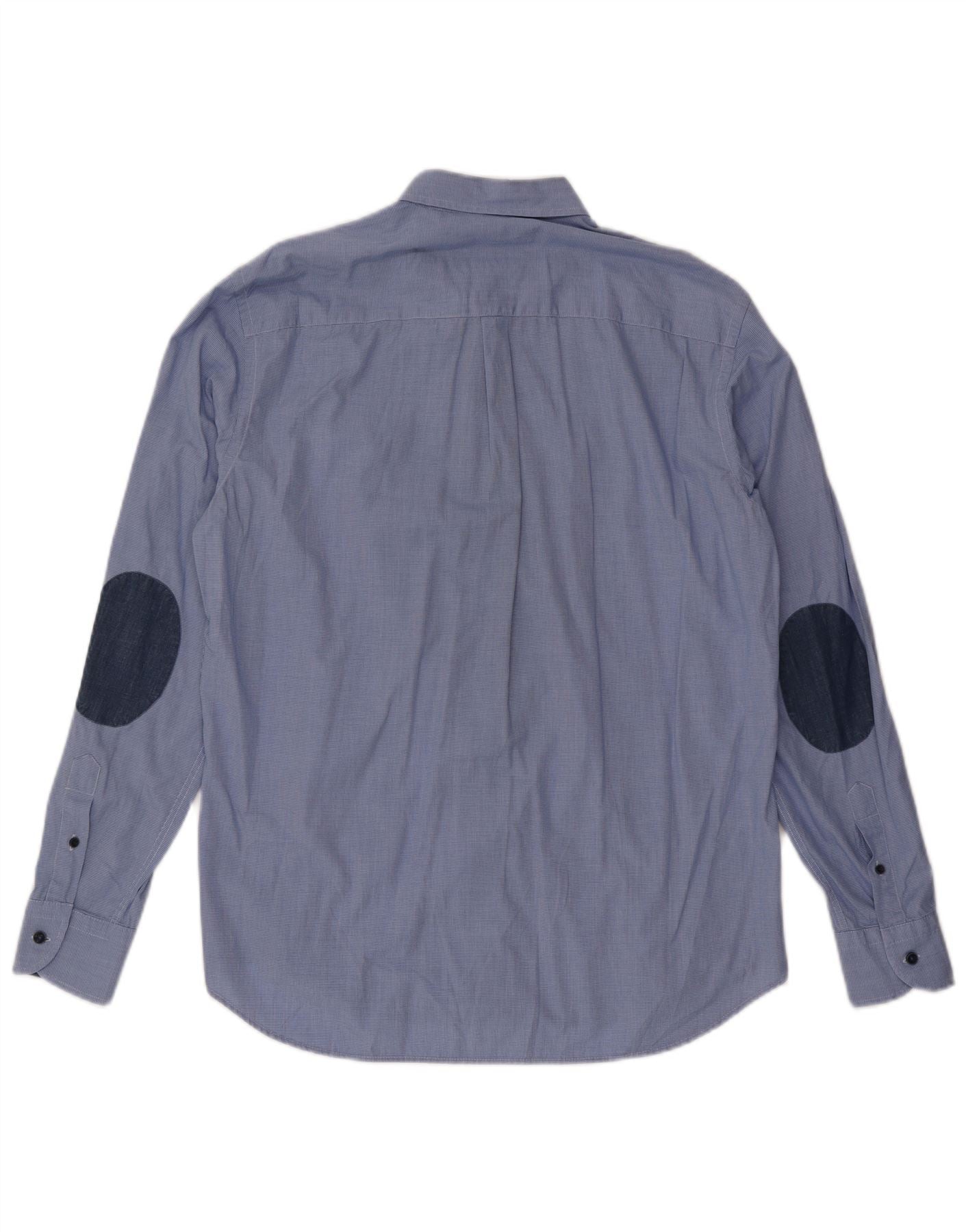 - AI Description: This Harmont & Blaine mens shirt is crafted from a blue woven fabric. It features a subtle check pattern throughout. The classic collared neckline and full button-up front offer a smart look. Long sleeves are finished with neat buttoned cuffs. Darker elbow patches add a distinctive detail. A small logo accent is visible on the chest. The regular fit ensures comfortable, versatile wear.